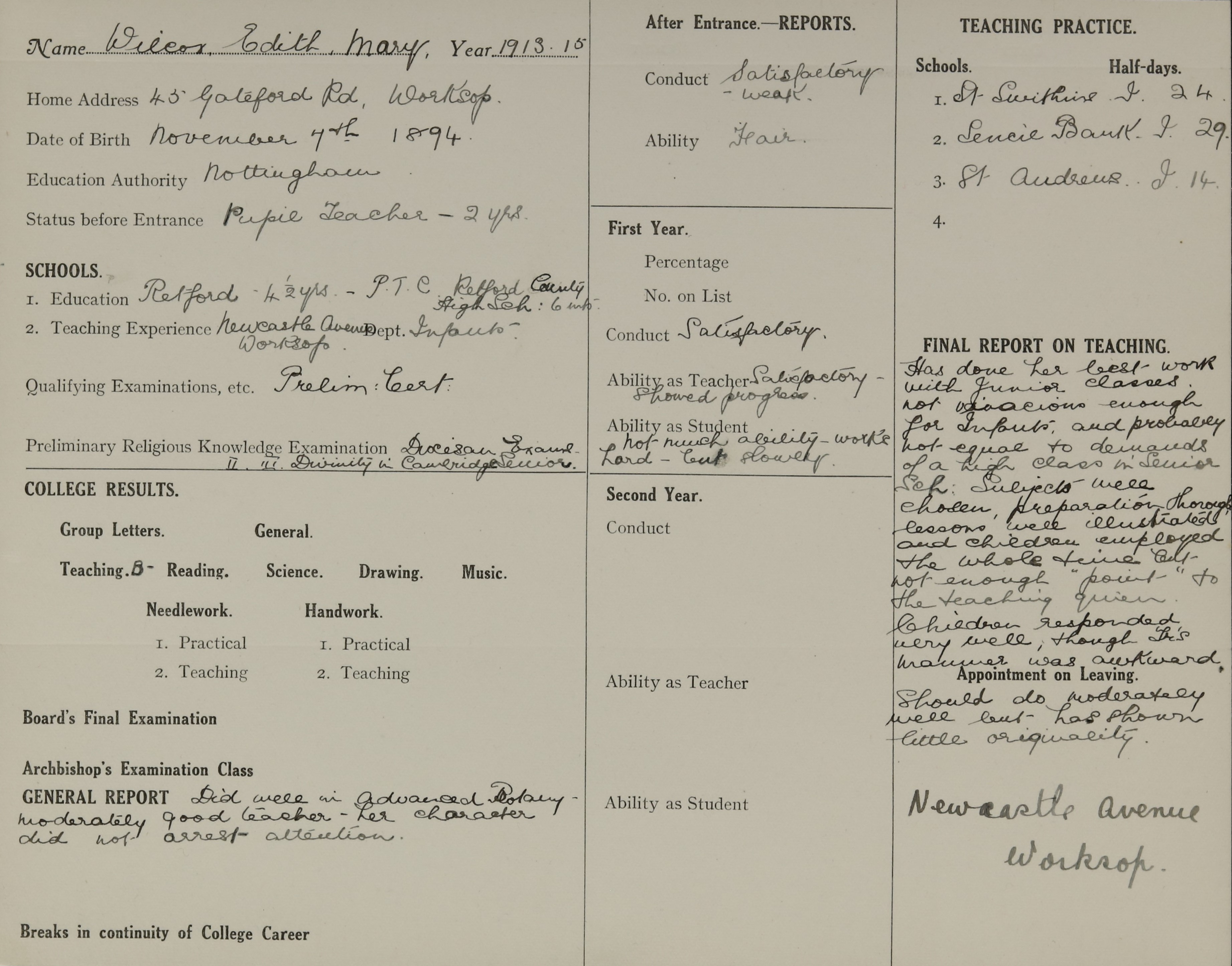 Qualification: Prelim. Cert. Exam. 1913 and Camb. Sen. Local.