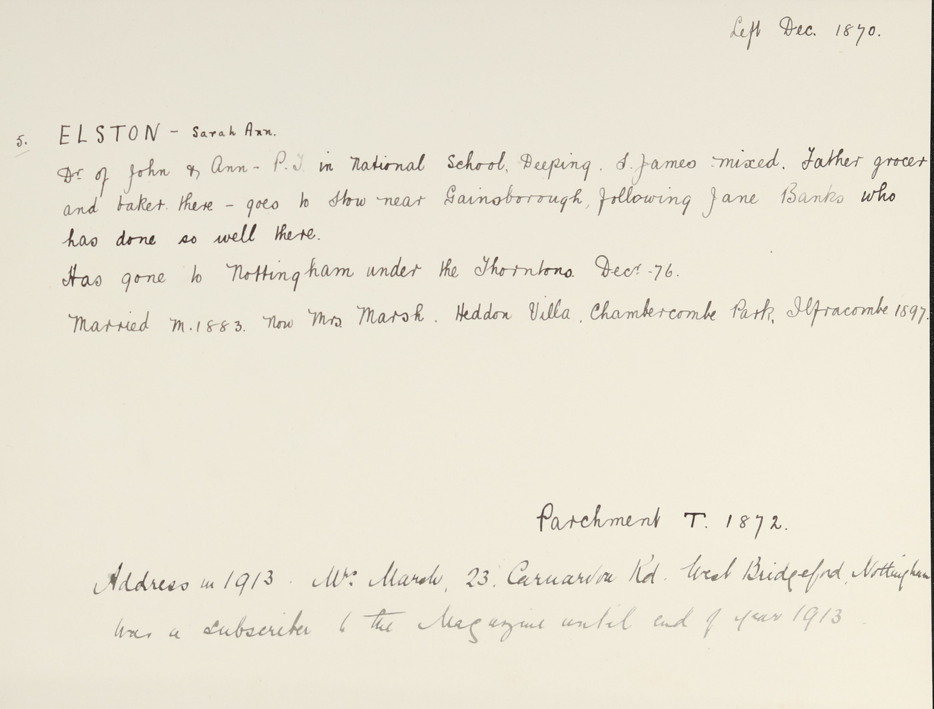 She is a boarder at Stow Town, Stow in Gainsborough. The head of the household is Samuel Blow (b. 1795), listed as ‘Retired Farmer’. His wife, Mary Blow (b. 1827) and their nephew, Joh Leachman (b. 1868) are unlisted. Sarah is listed as ‘Schoolmistress’.