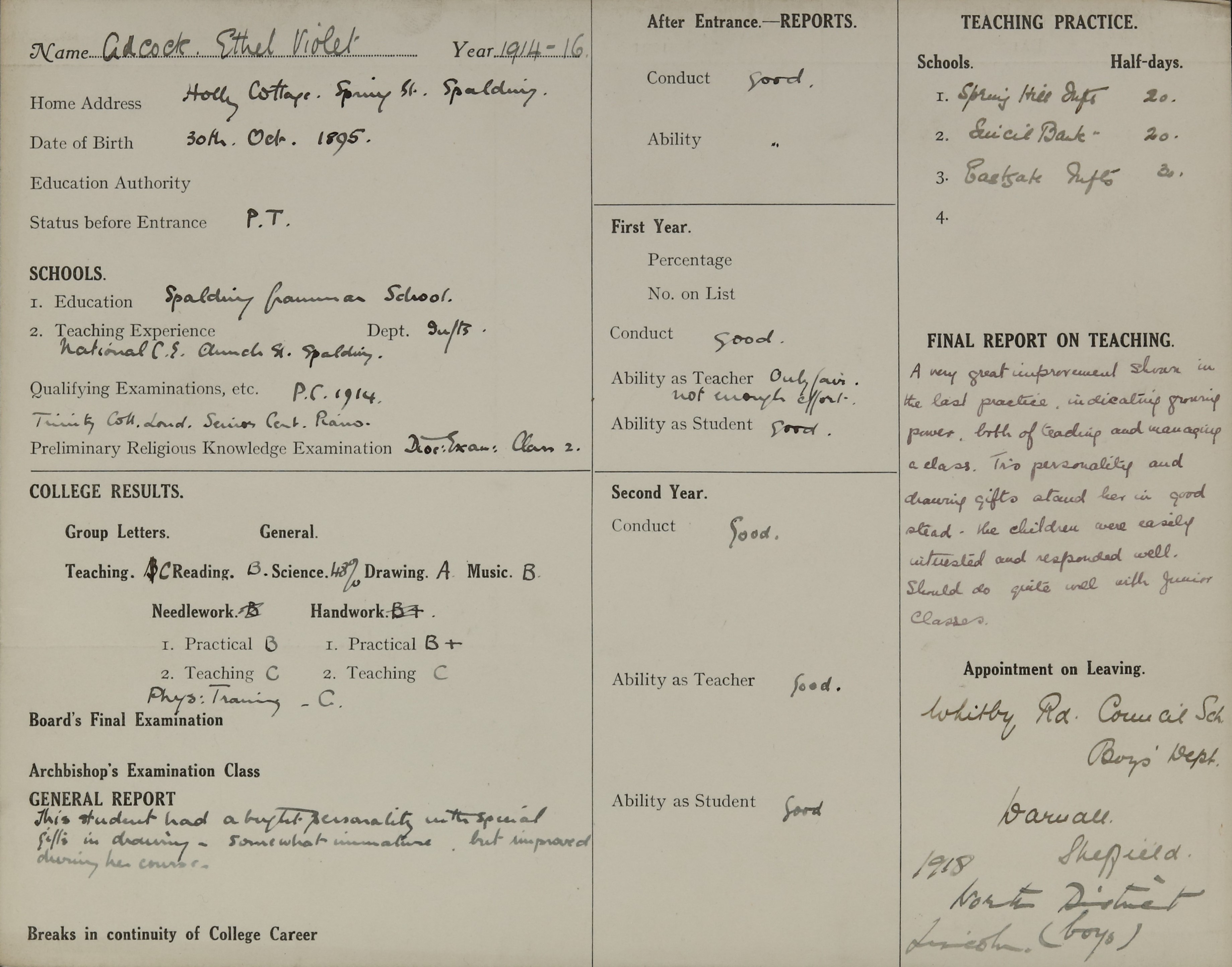 She is at 15 Crossways, Doncaster. Ethel and Dorothy Spinks (b. 1896) [LDTC 1918] are listed as ‘Headteacher Elementary School’. Winifred Halstead (b. 1903) is listed as ‘Assistant Teacher Elementary School’.
