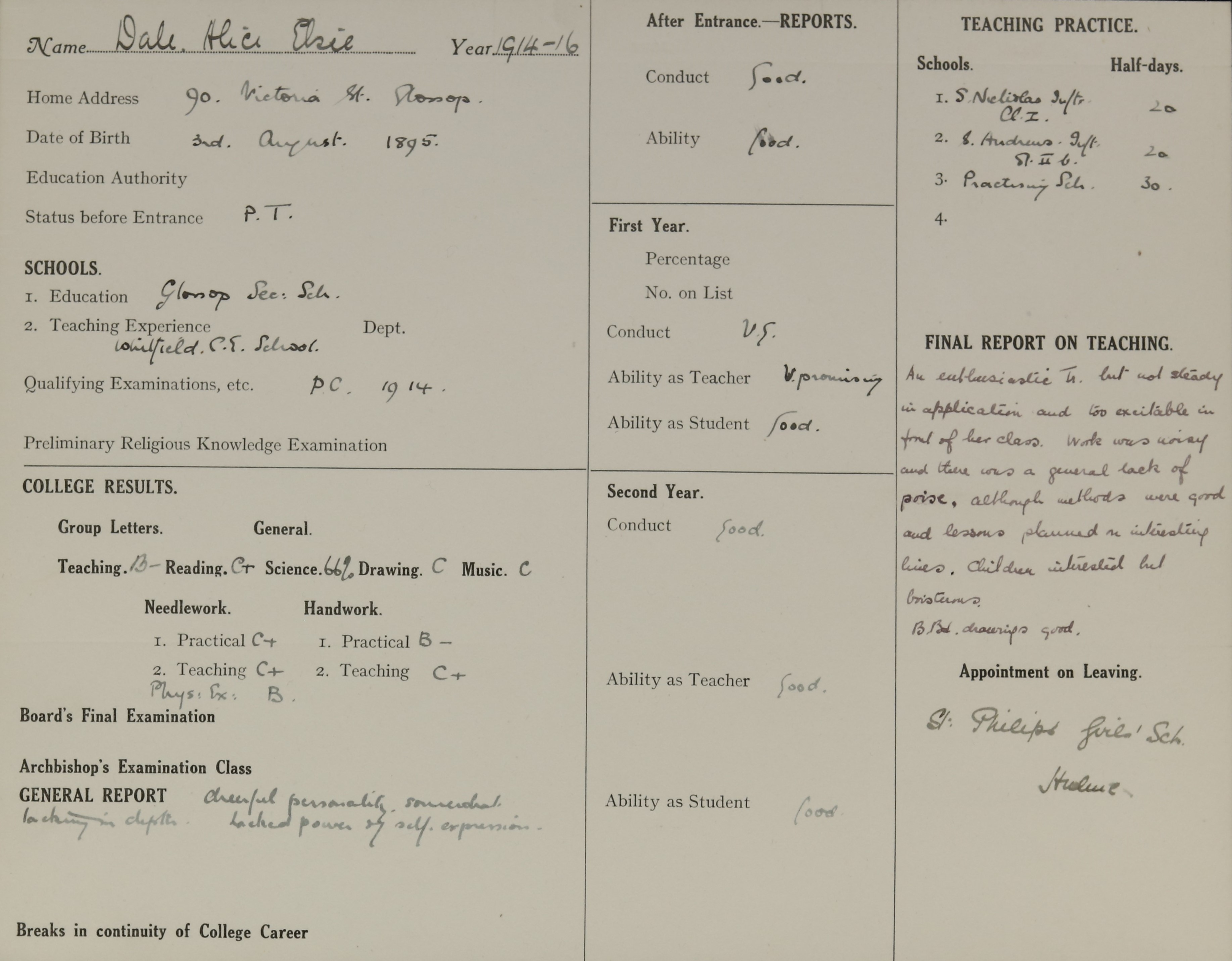 She is at 88 Victoria Street, Glossop. Her father is listed as ‘Newsagent’. Her mother and brothers, Irvine and George, are unlisted. Her brother, Joseph, is listed as ‘Brewers Engineers Draughtsman’. Alice is listed as ‘Elementary School Mistress’. Her brother, Richard, is listed as ‘Out Porter’. Her brother, John, is listed as ‘Works Chemist Apprentice’. There is a visitor, John H Norman (b. 1893), listed as ‘Jeweller’.