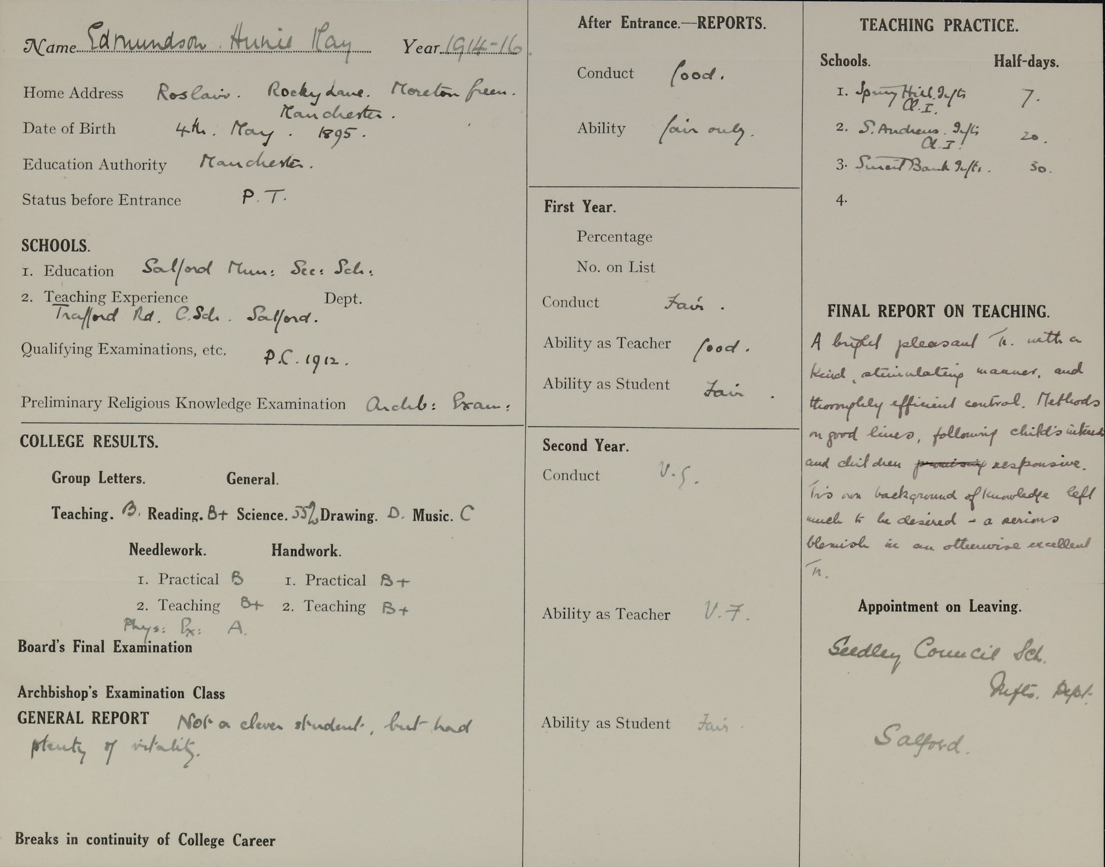 She is at 84 Rocky Lane, Monton, Eccles. Her father is listed as ‘Manufacturer Agent’. Her mother is unlisted. Annie us listed as ‘Schol Teacher’. Her brother, John, is listed as ‘Engineer Locomotive’.