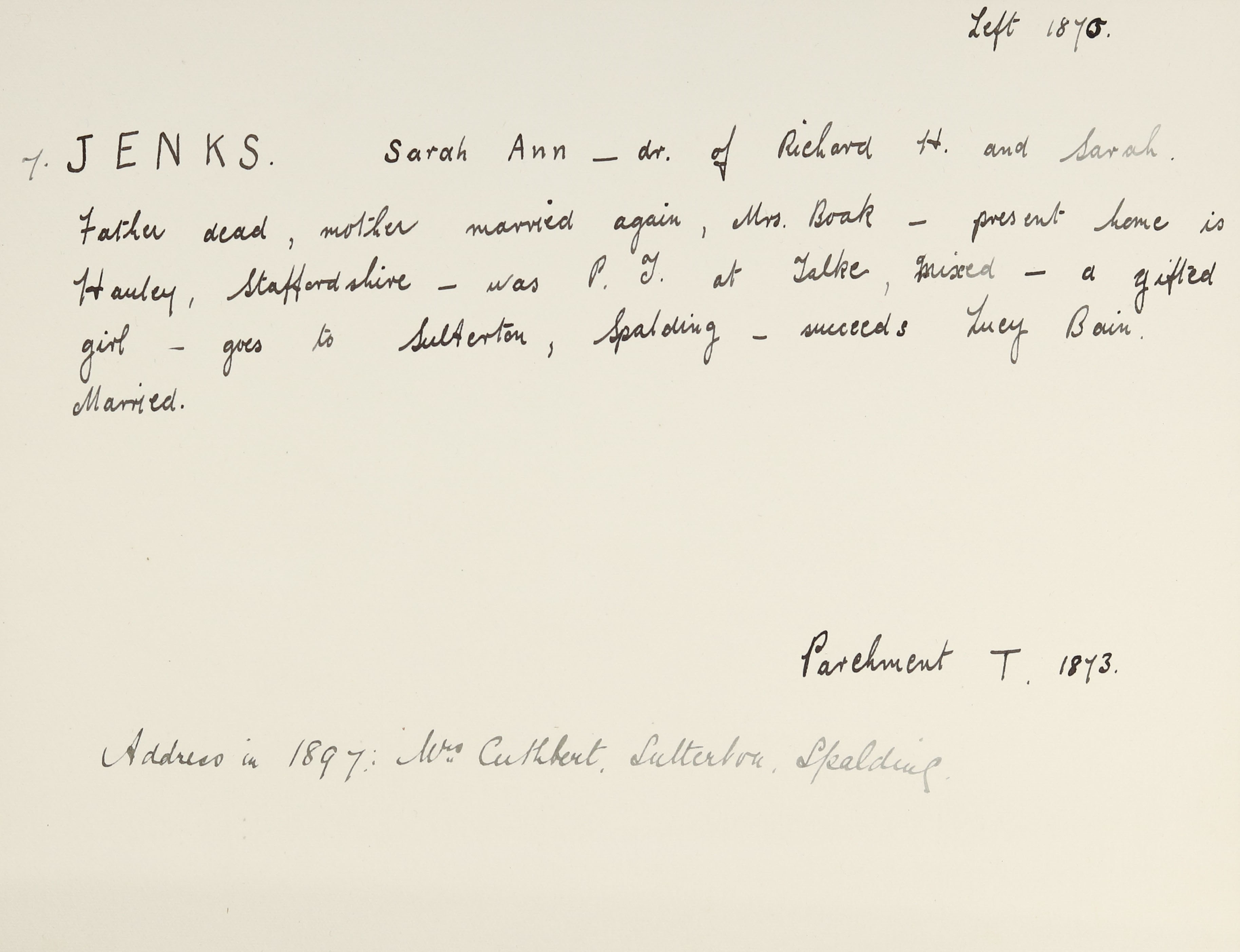 She is at Church Street National School, Sutterton. Sarah is listed as ‘National Schoolmistress’. Her half-sister, Lucy, is unlisted. There is also a Elizabeth A Robinson (b. 1854) ‘Assistant School Mistress’.