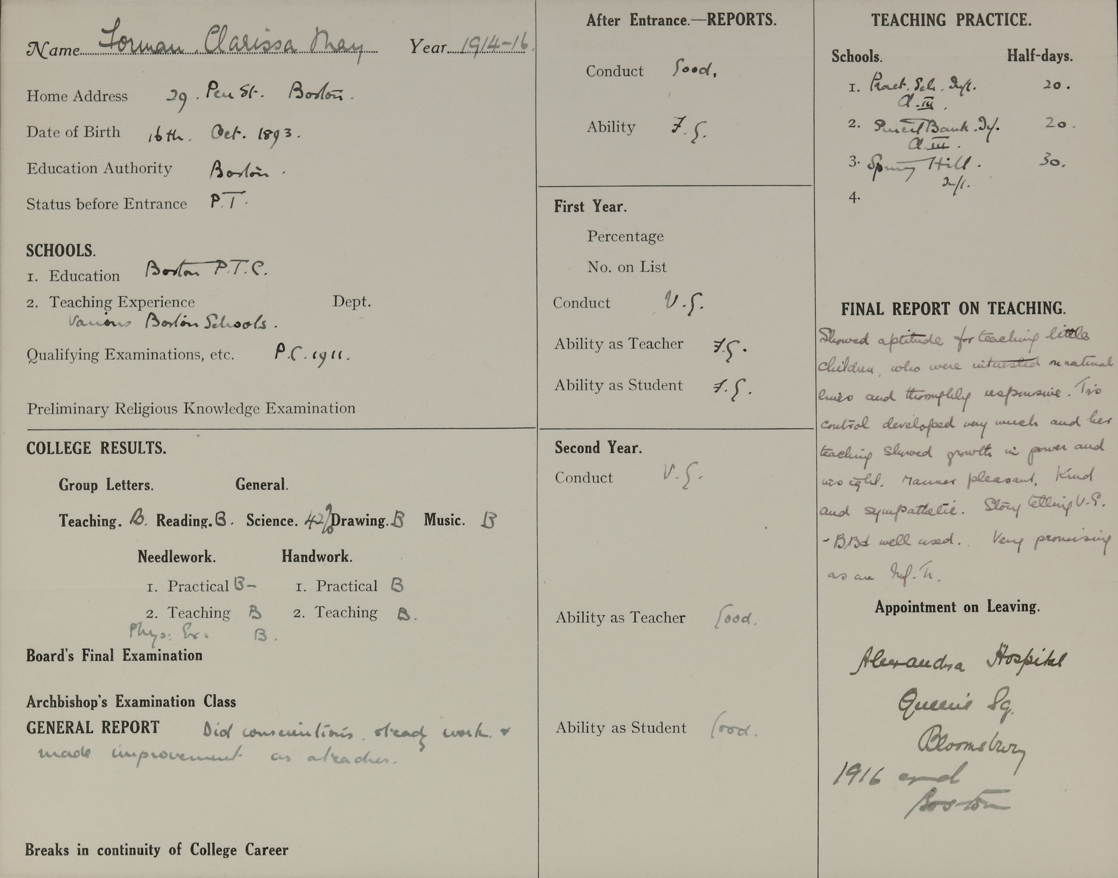 Appointed to Alexandra Hospital School, Queens Square, Bloomsbury, London.