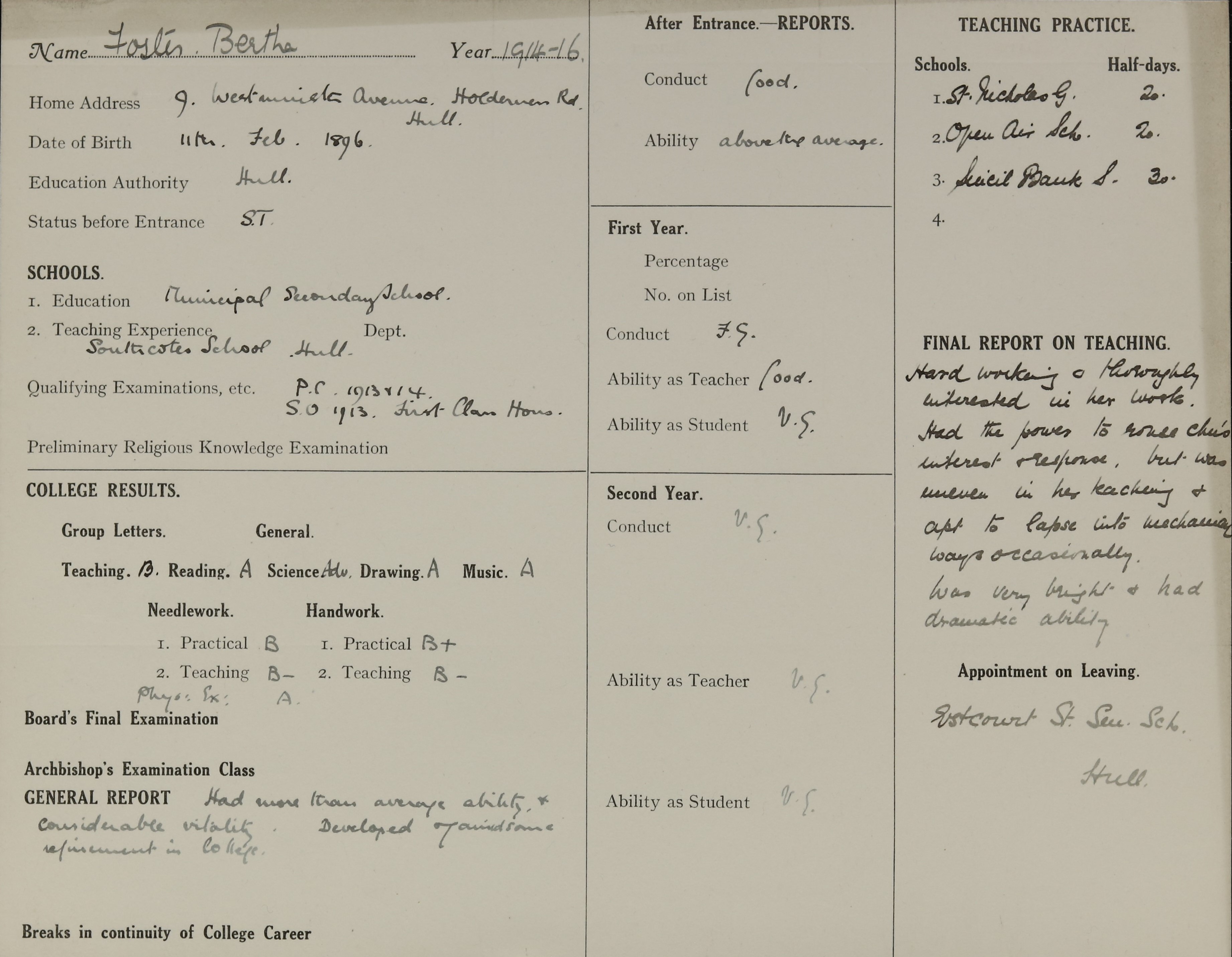 She is at 9 Westminster Avenue, Hull. Her sister, Matilda, is listed as ‘Clerk’. Bertha is listed as ‘Elementary School Teacher’.