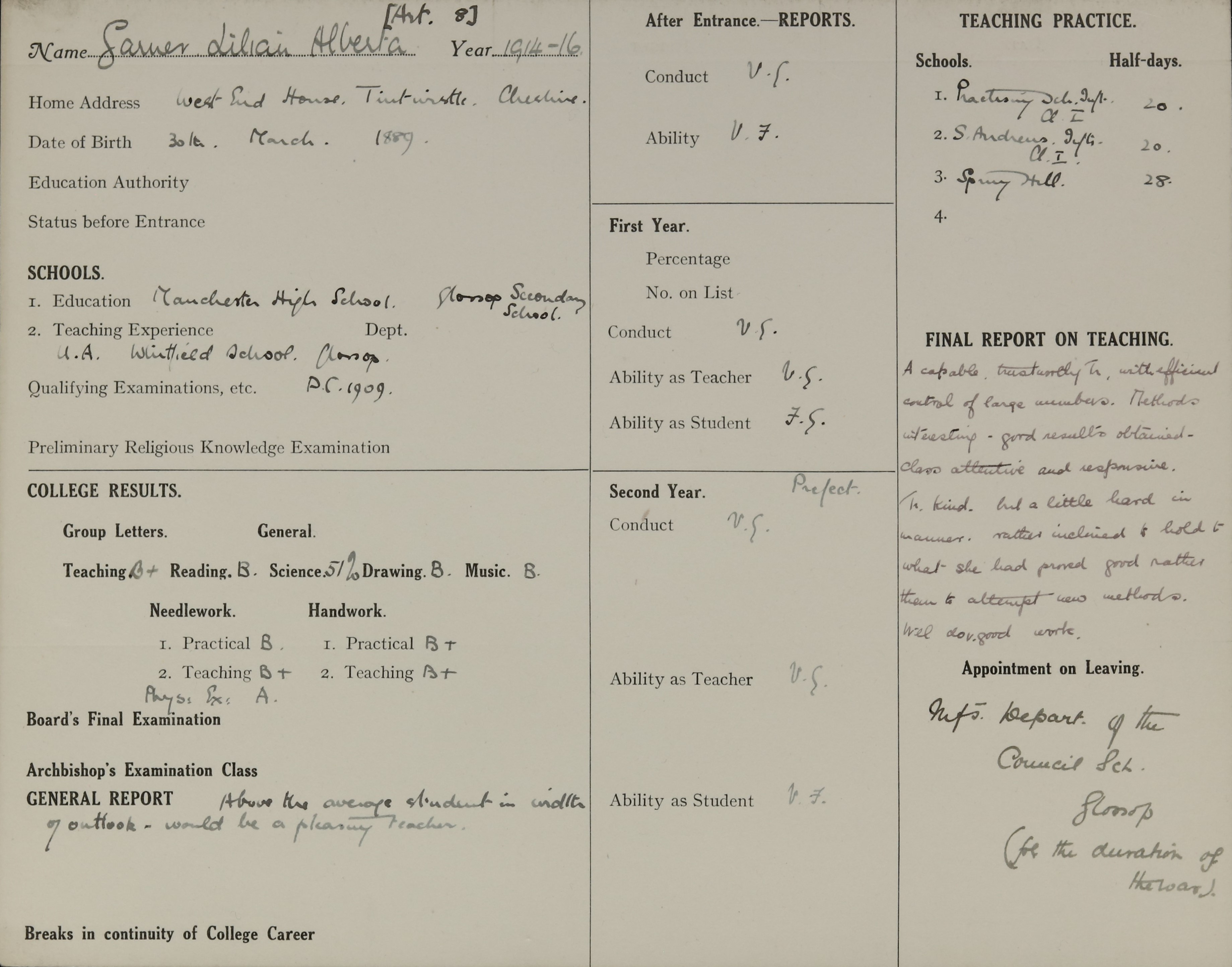 She is at 4 Woodhead Road, Tintwistle. Her sister, Florence, is unlisted. Lilian is listed as ‘Teacher’.
