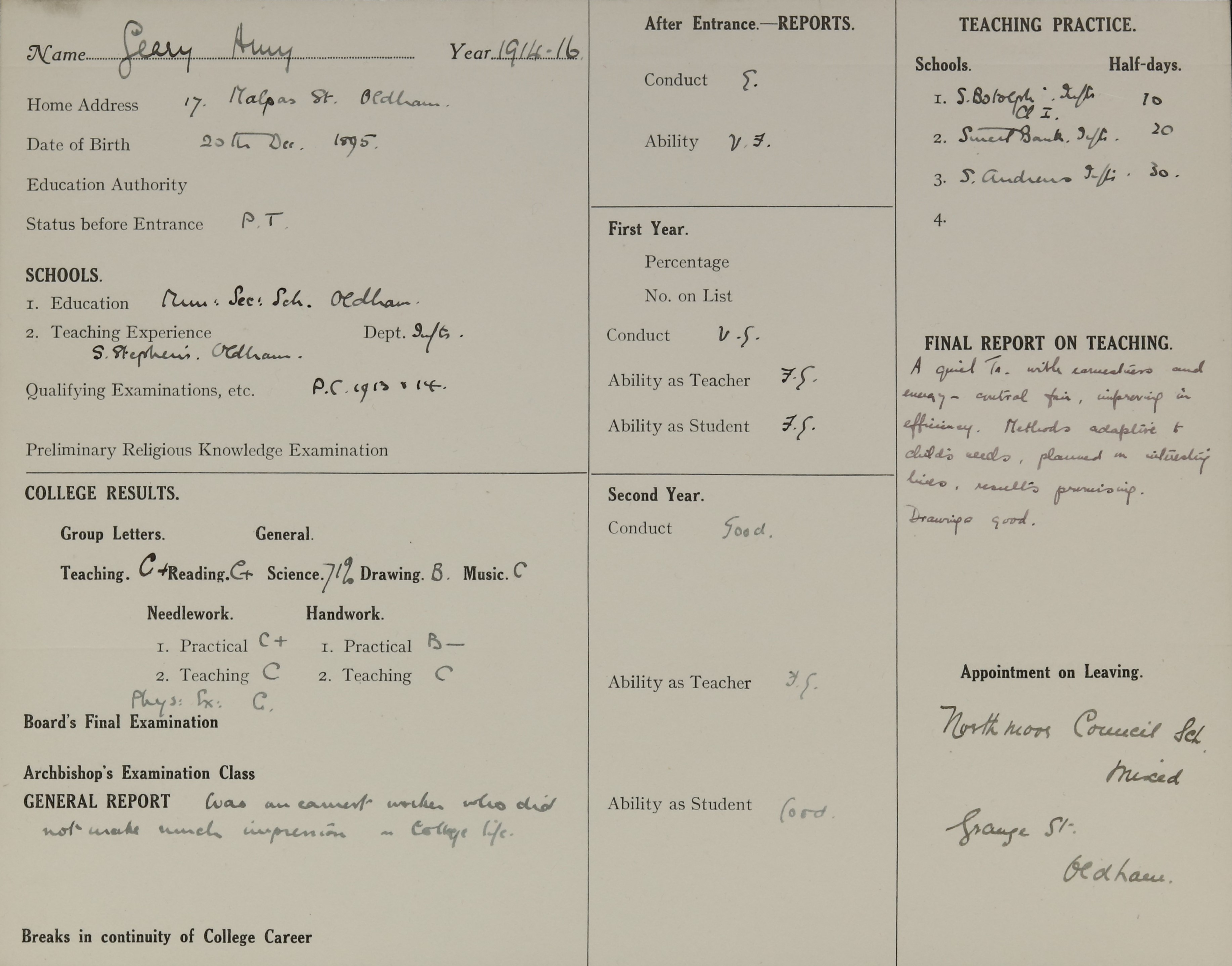 Appointed to Headmistress, Parish Church Infants' School, Oldham.