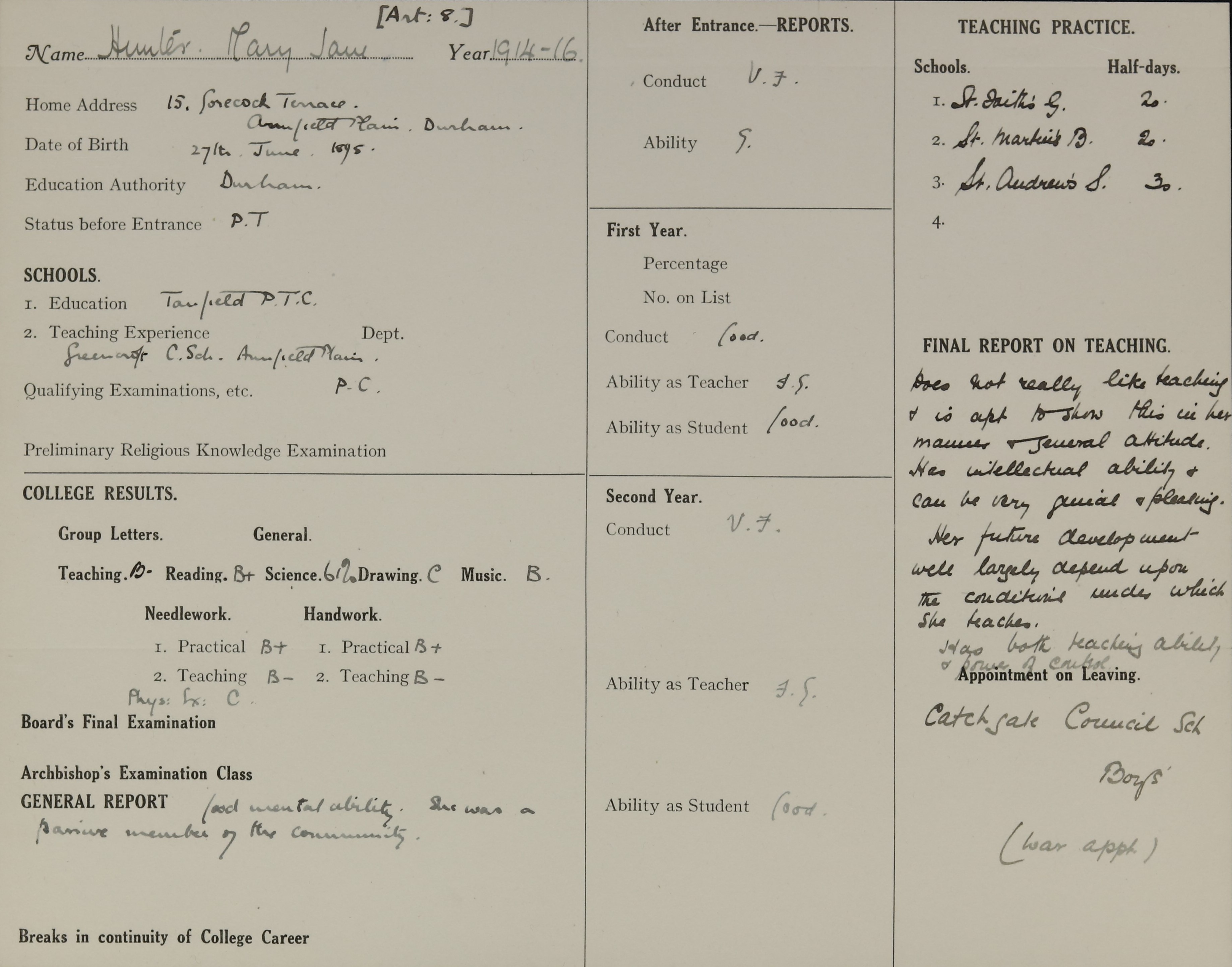 Appointed to Catchgate Council Boys, Sheffield.