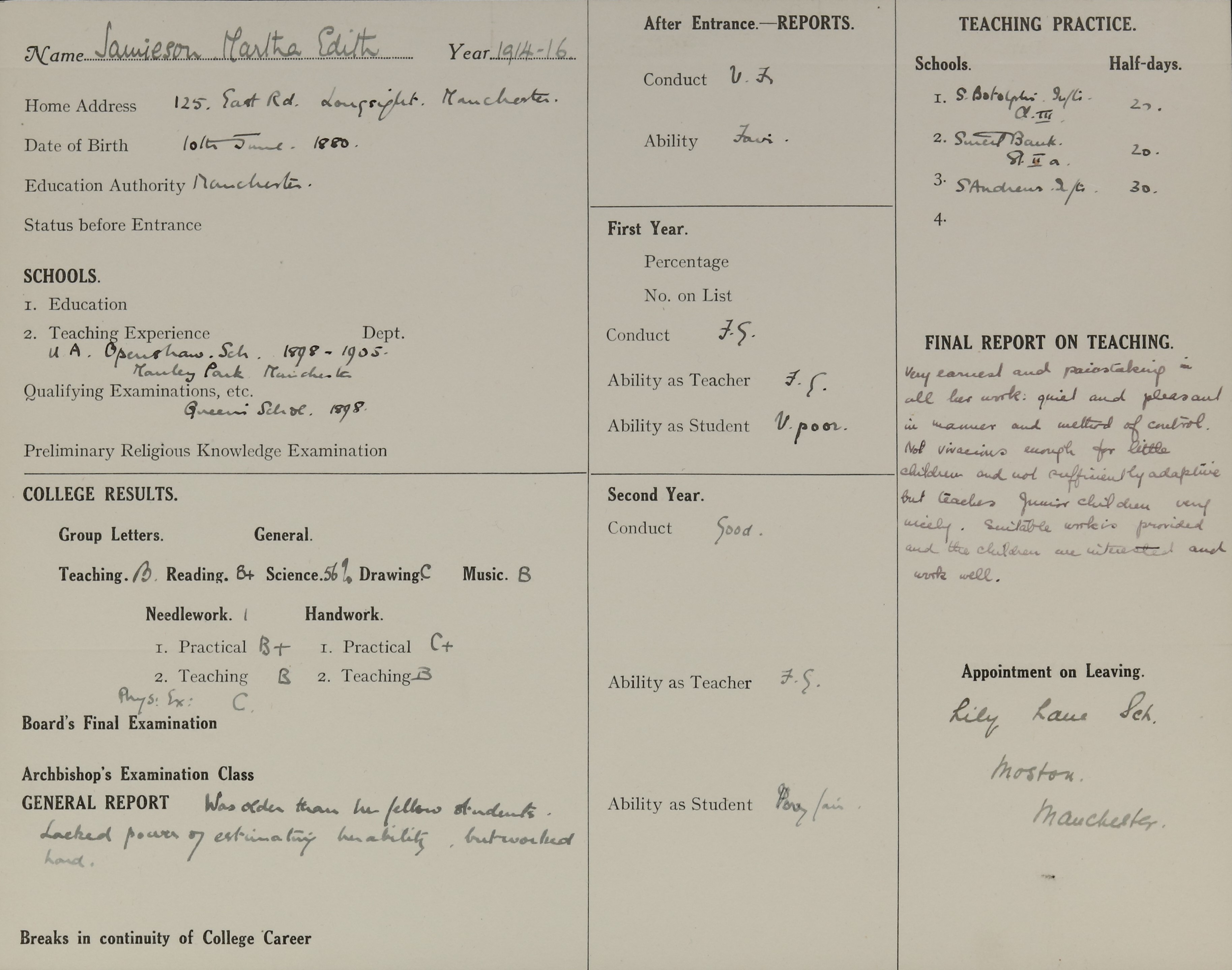 Appointed to Lily Lane School, Moston, Manchester.