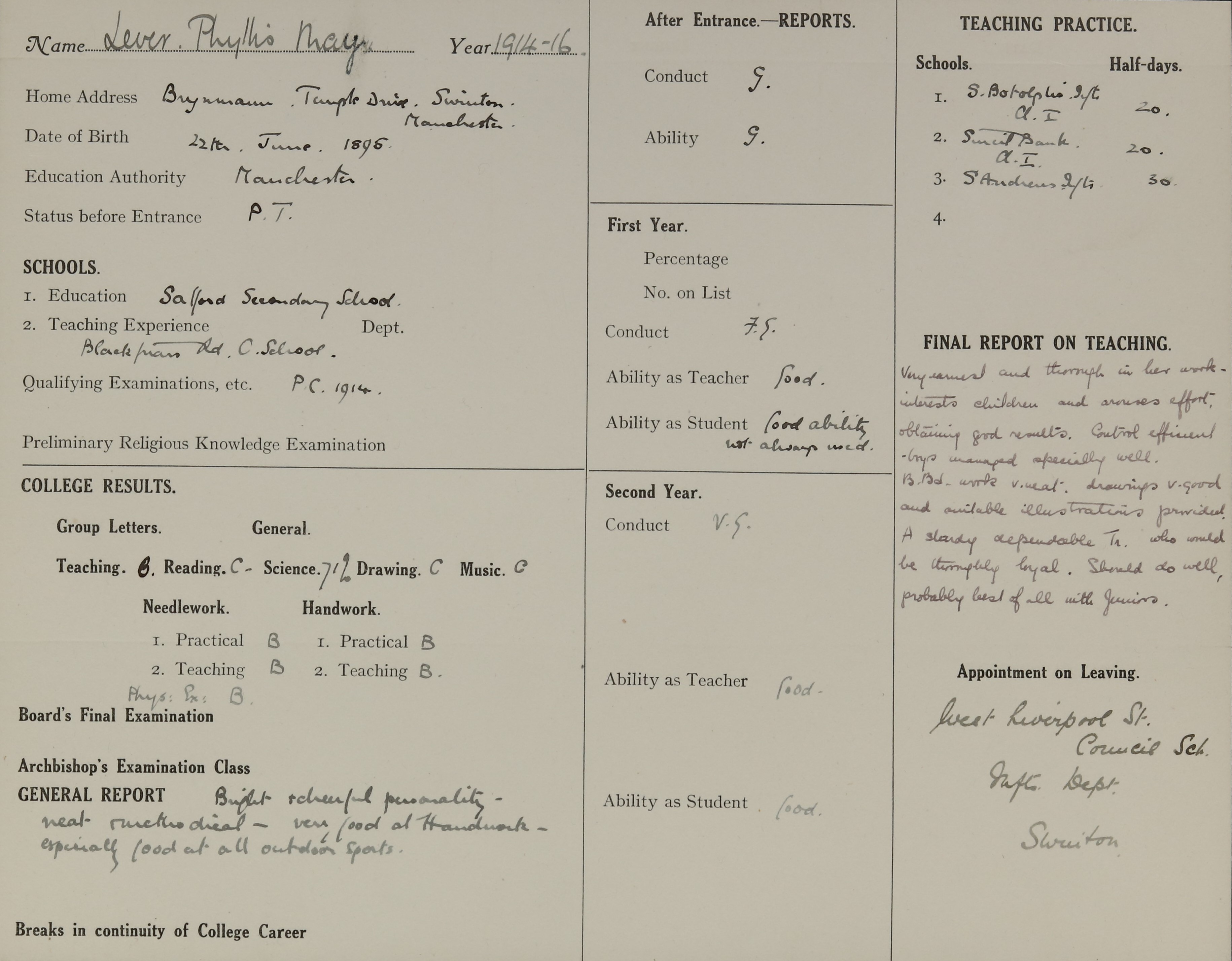 Appointed to West Liverpool Street Infants, Manchester.