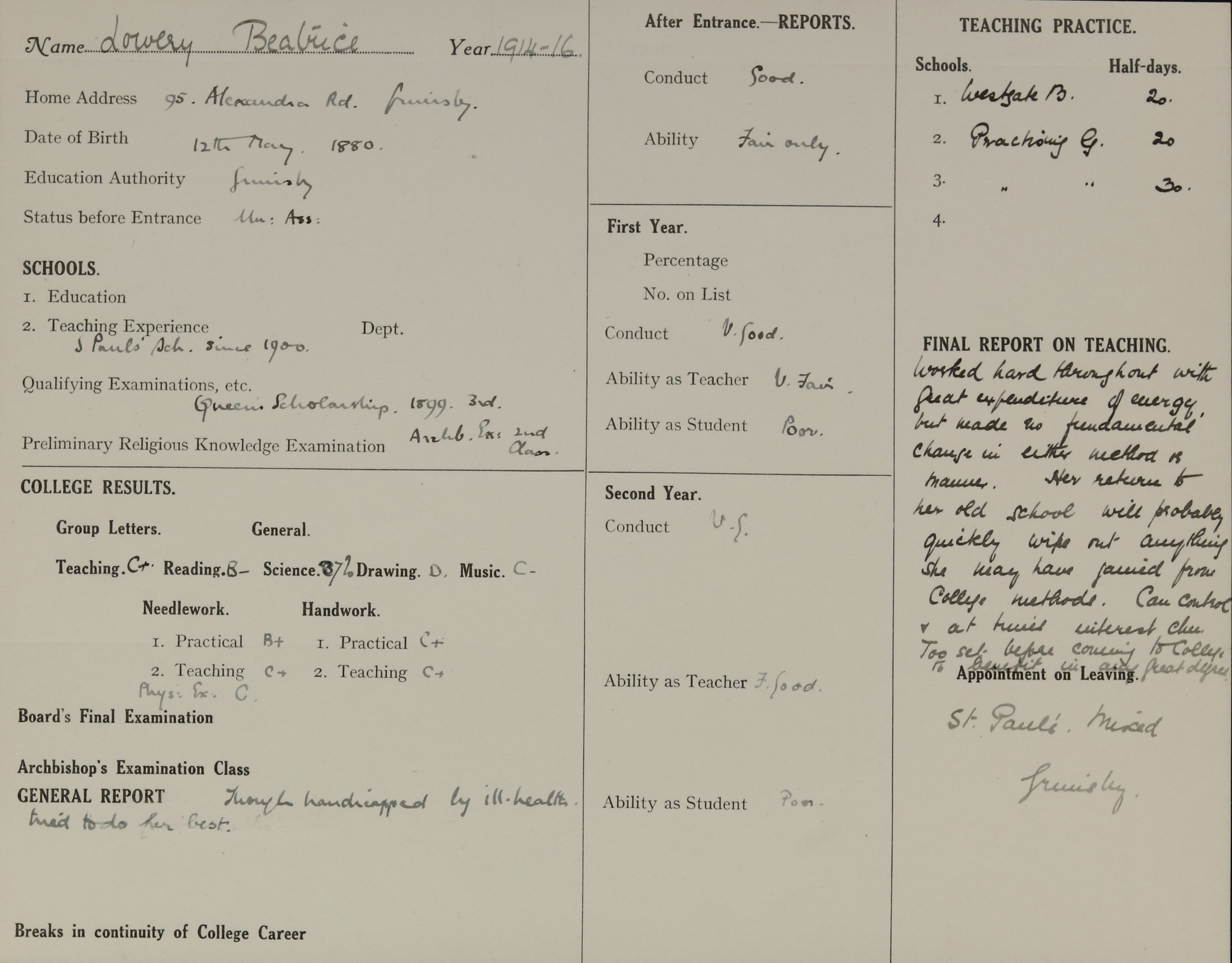 She is at 95 Alexandra Road, Grimsby as a boarder. The head of the house, Agnes Annie Hutton (b. 1875), is unlisted. Beatrice is listed as boarder and ‘Teacher Certified’.