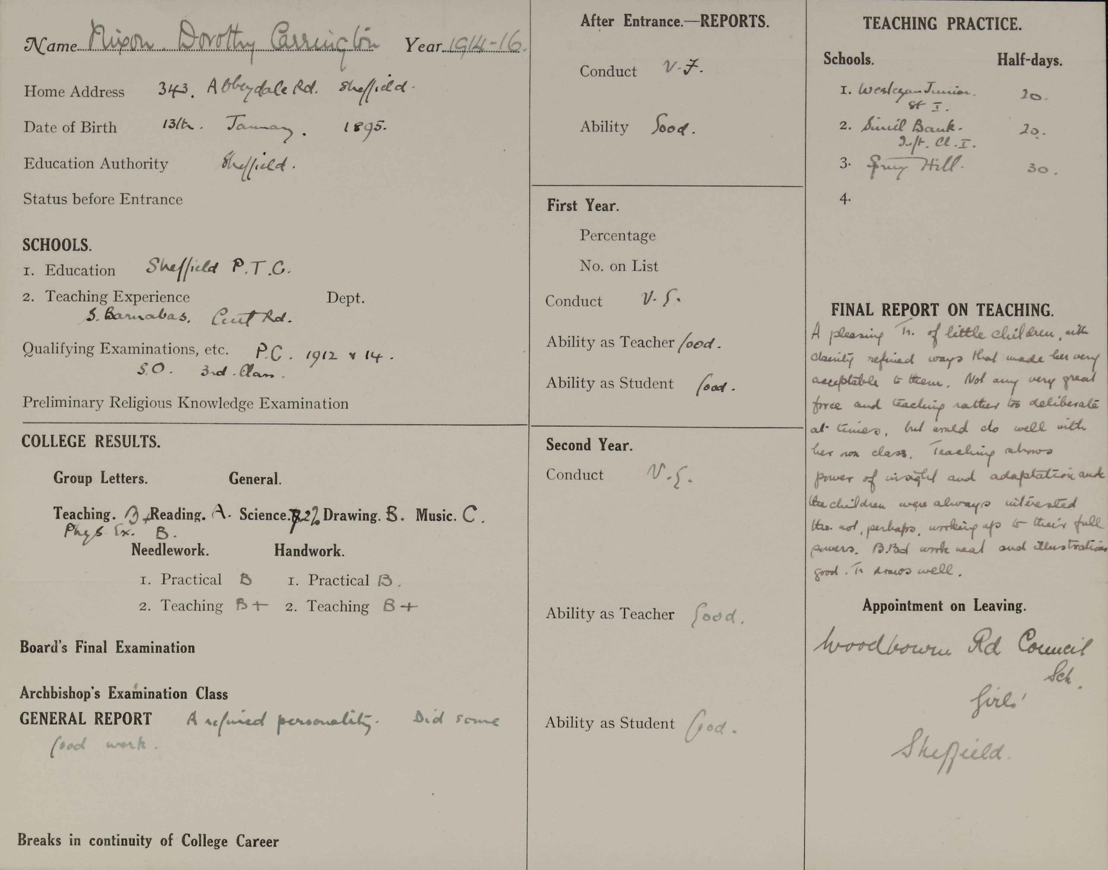 She is at 292 Abbeydale Road, Sheffield. Her father is listed as ‘Electrical Engineer and Cycle Agent’. Dorothy, her mother and siblings (Thomas, Bessie and Marjorie) are unlisted.