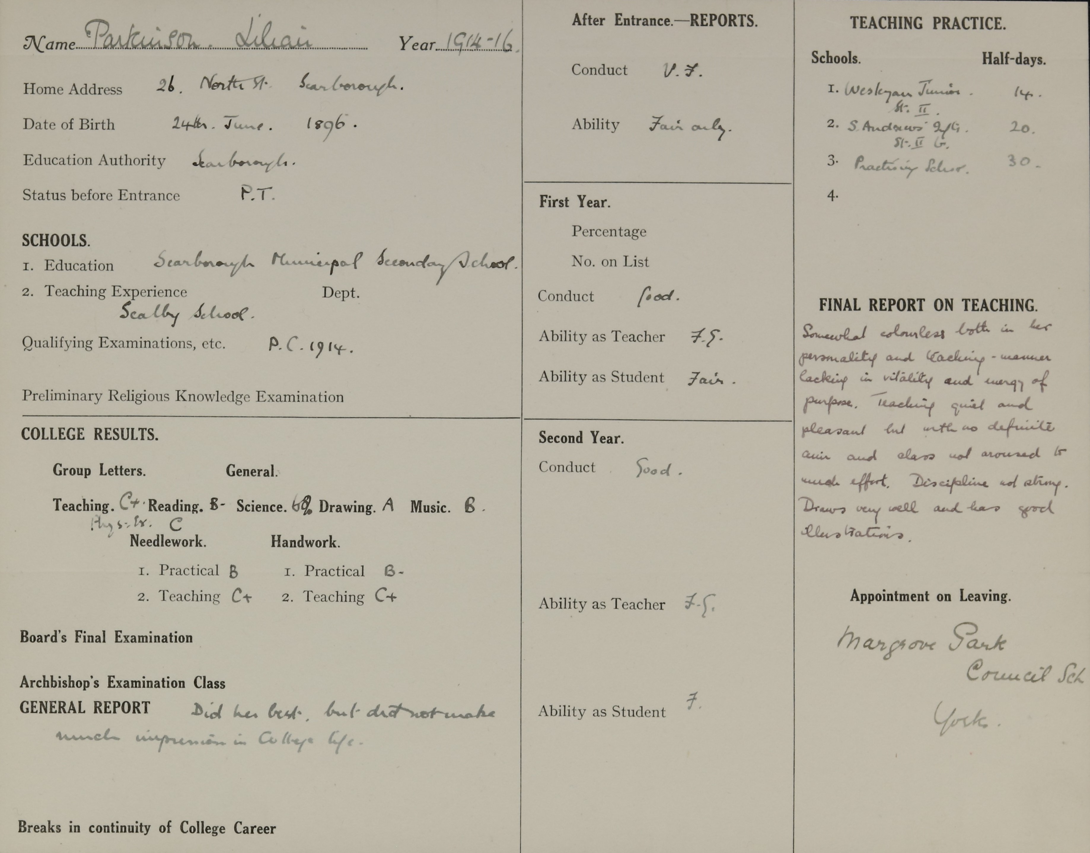 She is at 46 Eden Street, Saltburn as a boarder. The head of the house, Clara Dodsworth (b. 1856), is listed as ‘Boarding House Keeper’. Thomas Frederick Thompson (b. 1892) is listed as a boarder and ‘Engineers Fitter’. Lilian is listed as a boarder and ‘School Teacher’.