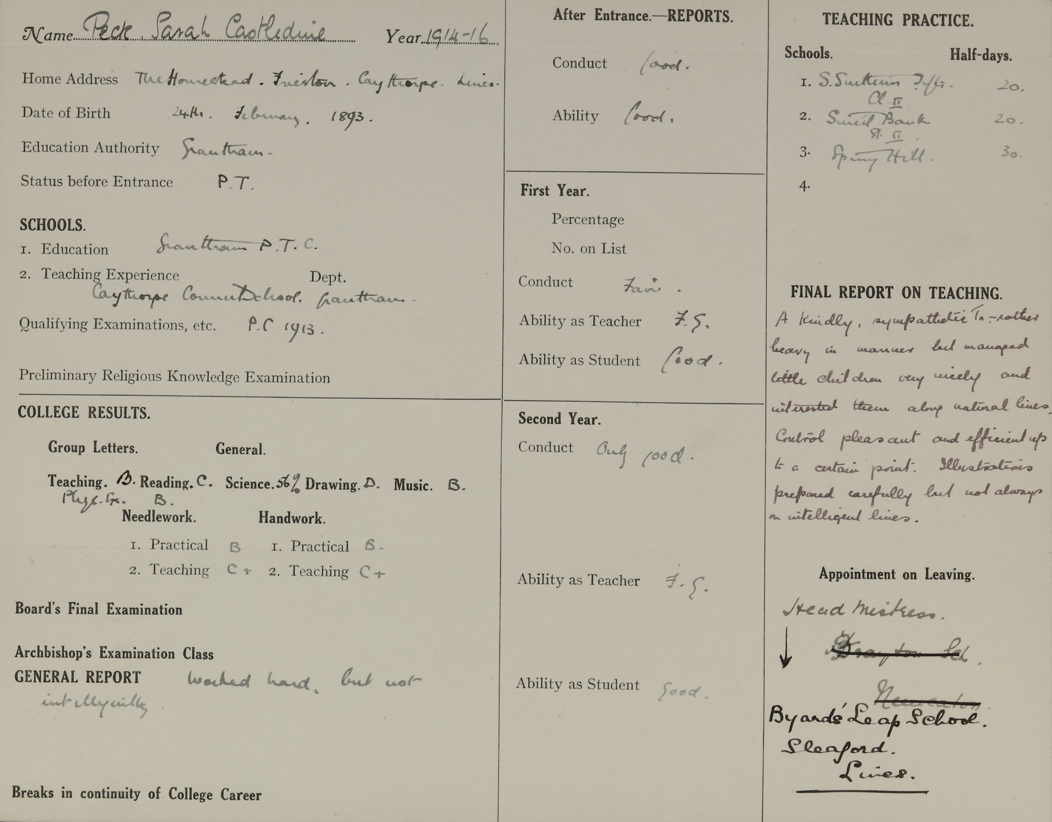 She is at Freeston Corner, Hough on the Hill. Her father is listed as ‘Farm Labourer’. Sarah is listed as ‘Pupil Teacher’. Her mother and her nephew, William Johnson (b. 1900), are unlisted. Her sister, Jemima, is listed as ‘Dressmaker’.