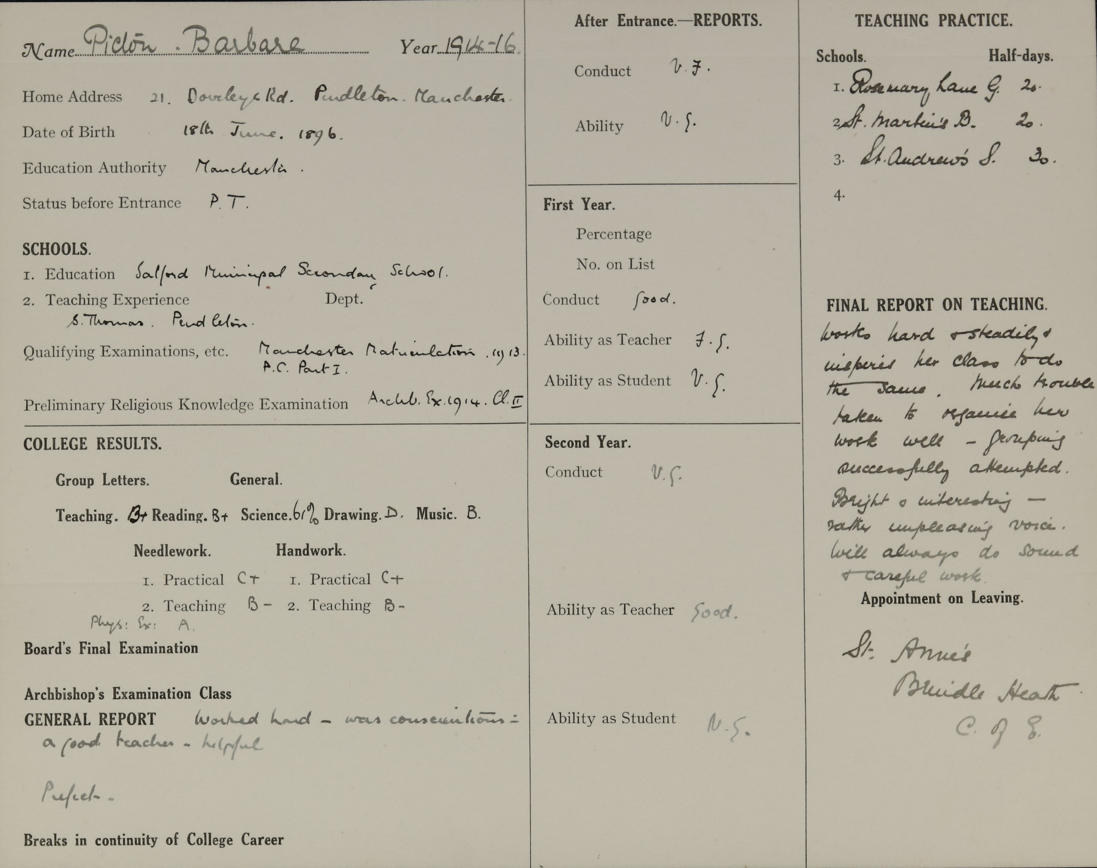 Appointed to St. Anne's, Brindle Heath, C.E. Girls, Salford.