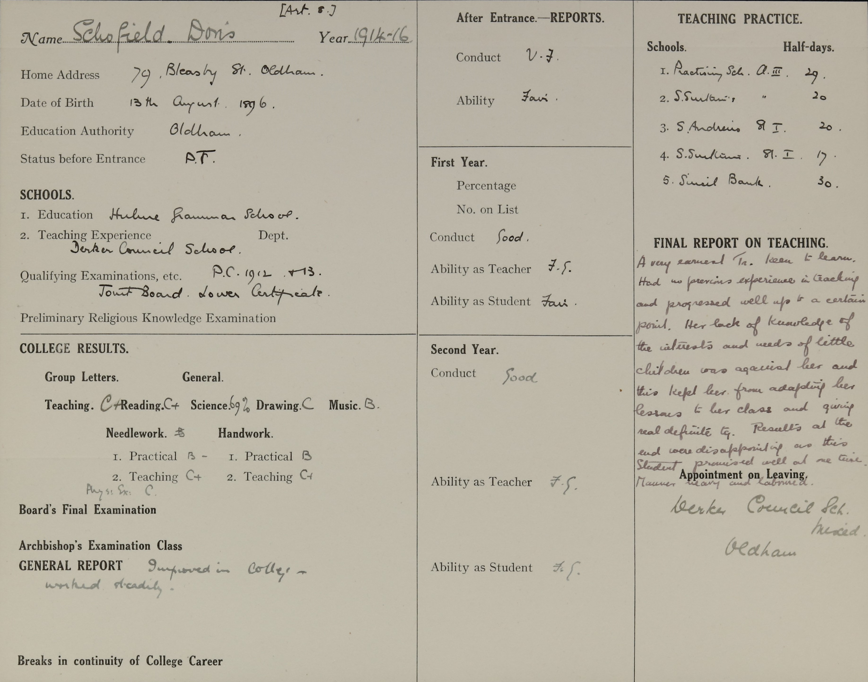 Appointed to Derker Council School, Oldham.