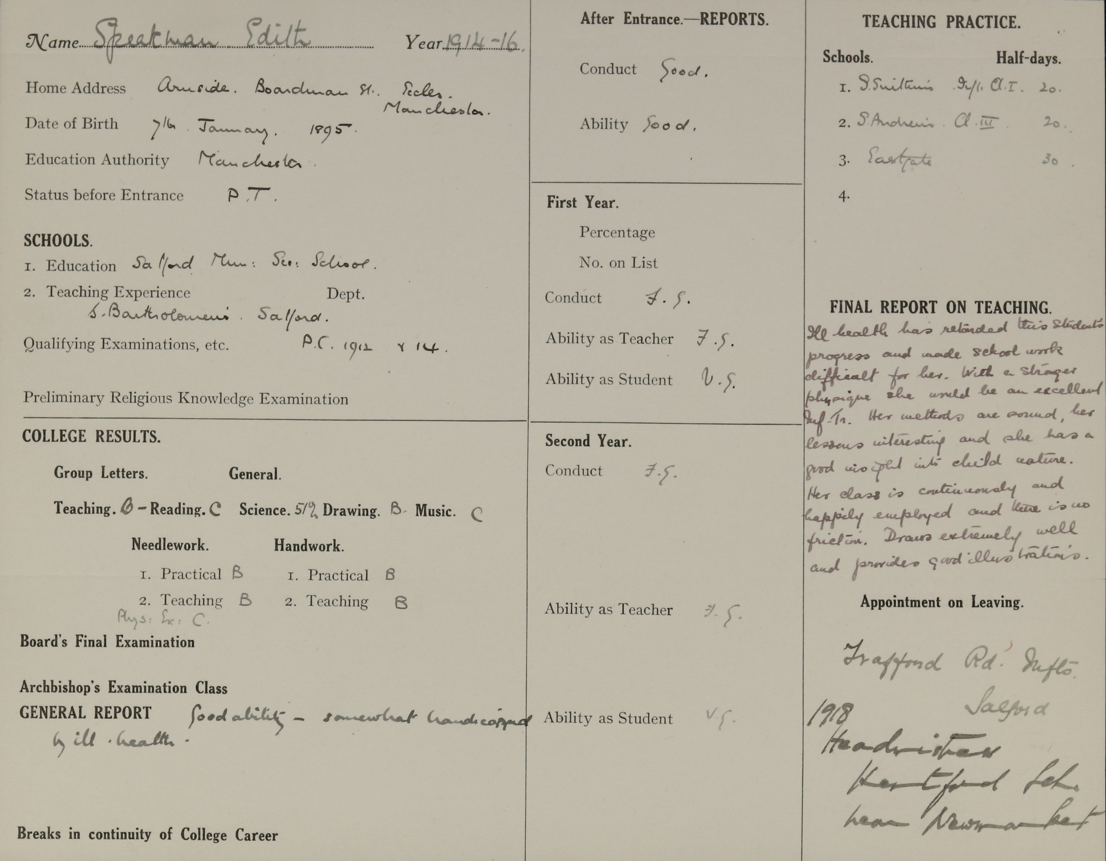 She is at 6 Half Edge Lane, Eccles. Her father is listed as Insurance Superintendent’. Her mother and sister, Annie, are unlisted. Edith and her sister, Harriet, are listed as ‘Teacher’. Her brother, Harold, is listed as ‘Clerk’.
