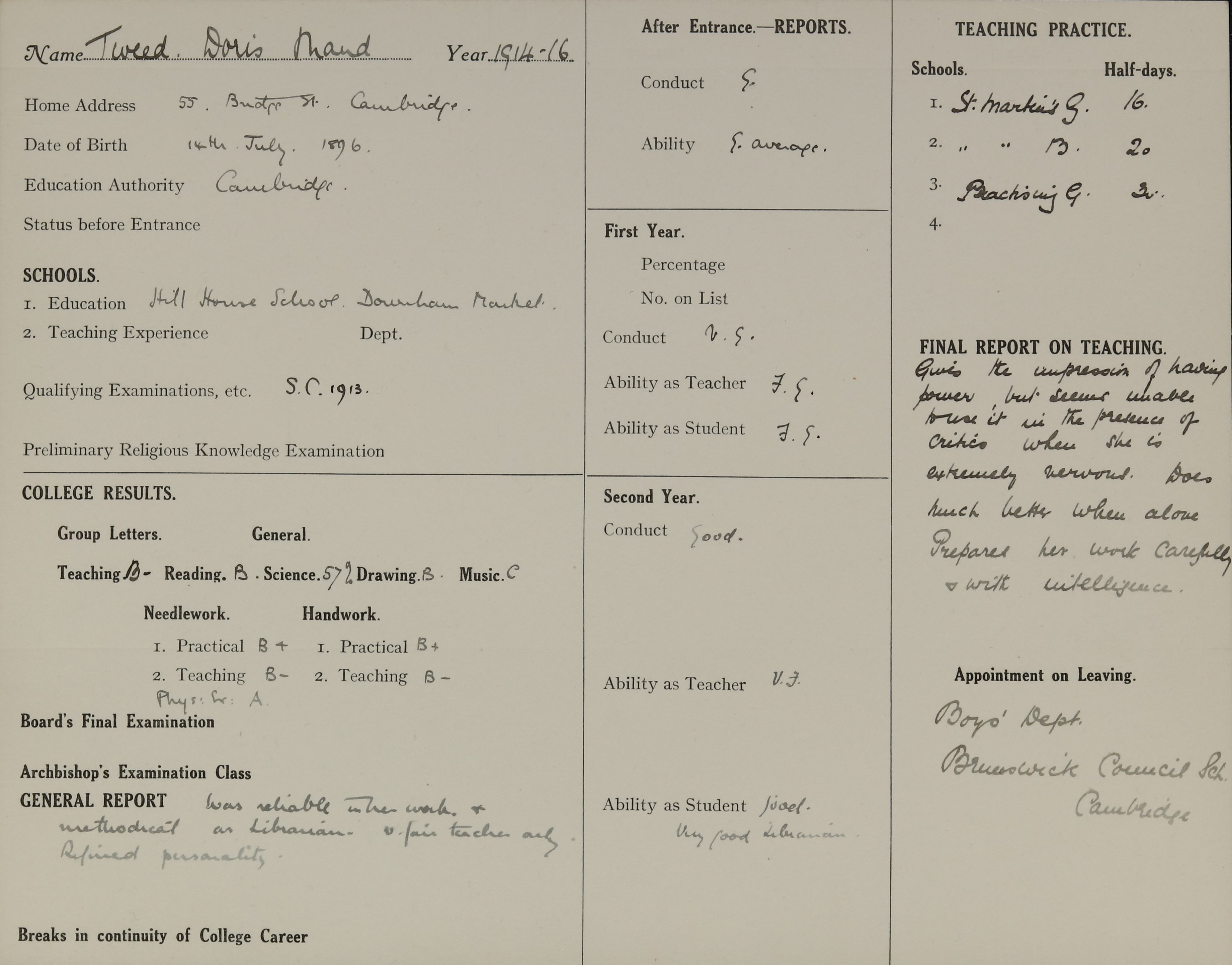 She is at 32 Lensfield Road, Cambridge. Doris is listed as ‘School Teacher’.