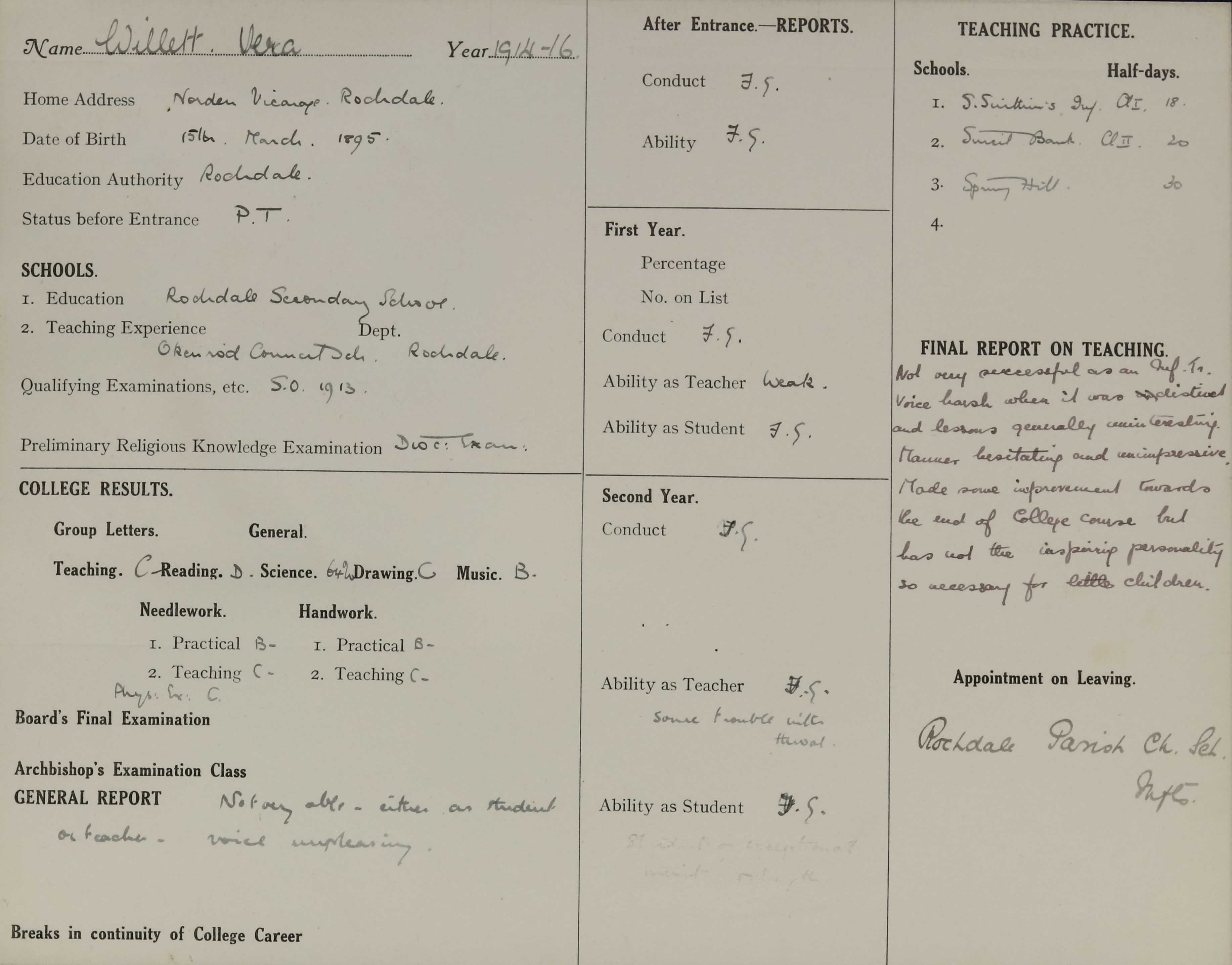 She is at The Vicarage, Norden, Lancashire. Her father is listed as ‘Clerk In Holy Orders’. Her mother is unlisted. Vera and her sisters, Hilda and Brenda, are listed as ‘School Teacher Elementary’. Her brother, Bertram, is listed as ‘Clerk’.