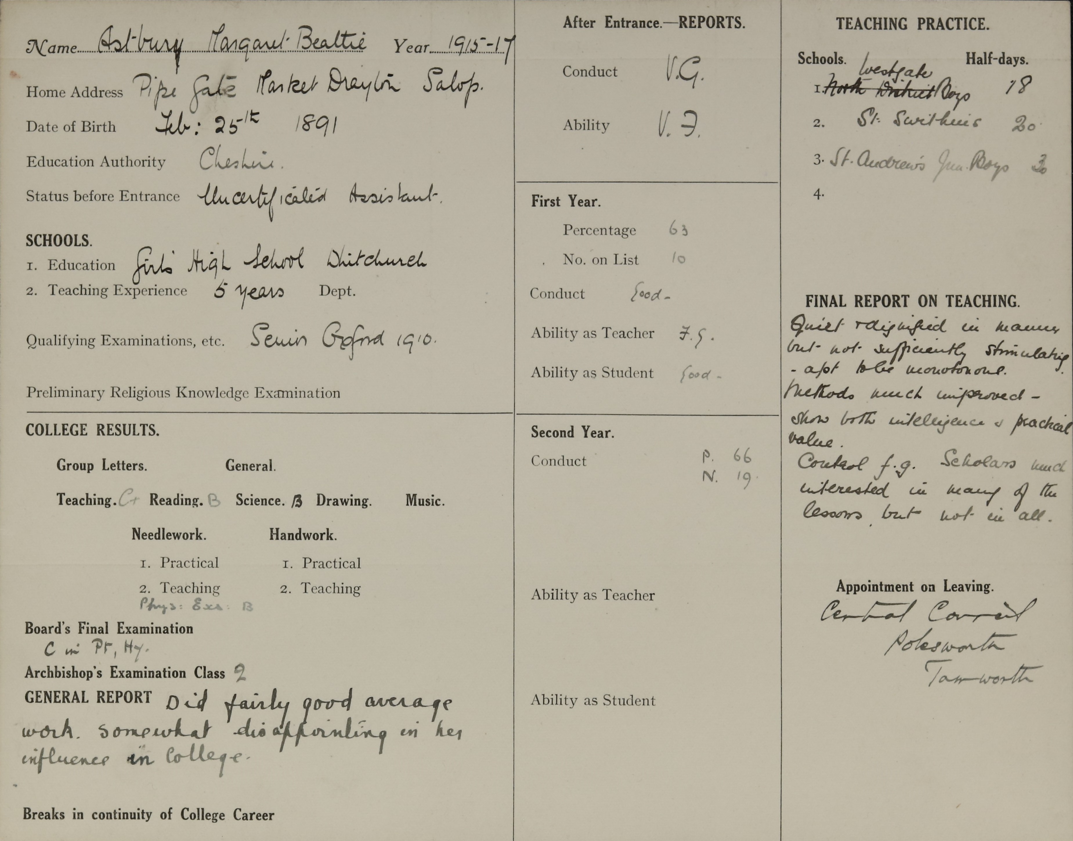 She is at 10 Legge Street, Newcastle under Lyme. Her father is listed as ‘Schoolmaster’. Margaret, her mother and her siblings (Constance and Frank) are unlisted.