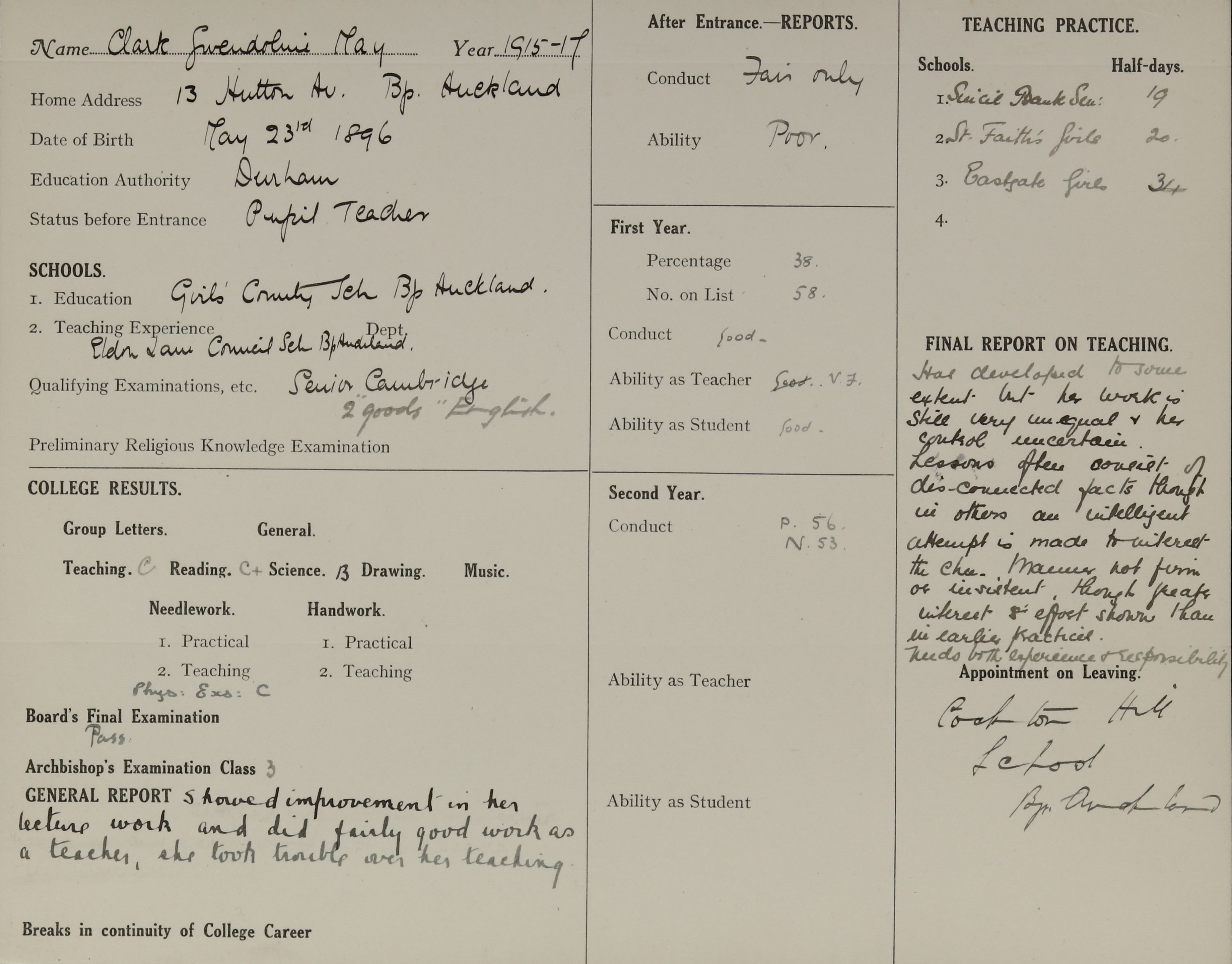 Appointed to Cockton Hill School, Bishop Auckland, Durham.