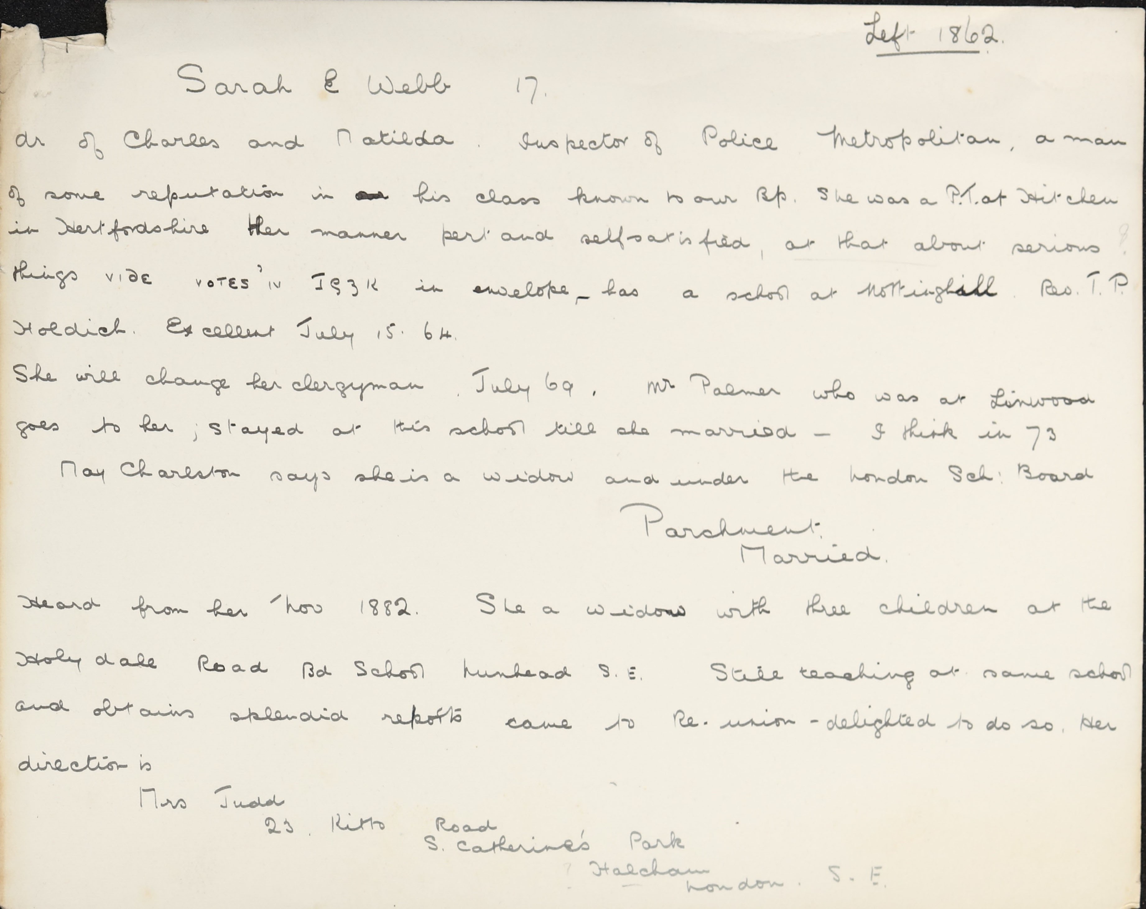 She is at 7 Arbuthnot Road, St Paul, Deptford. Sarah is listed as a widow and ‘Teacher London School Board’. Her sister-in-law, Charlotte Judd (b. 1851), is listed as ‘Private Governess’. Her children (Robert, Walter and Elizabeth) are unlisted.