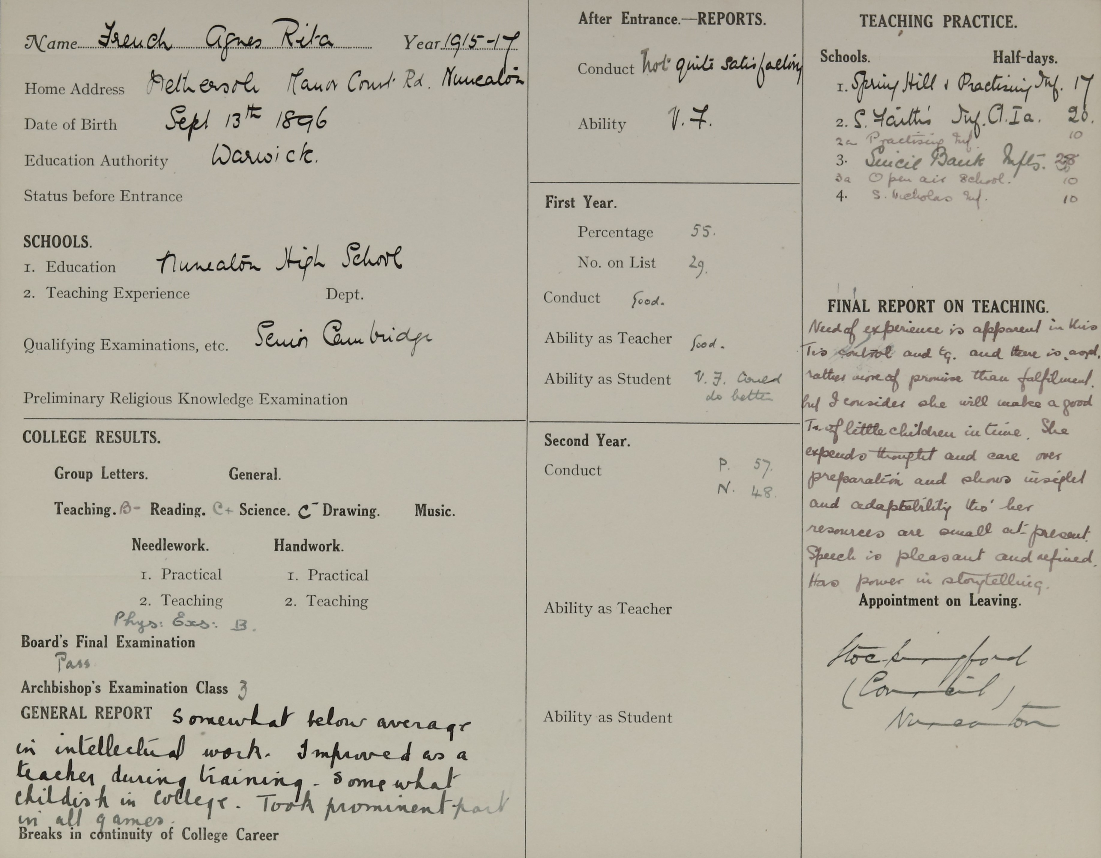 She is at Claremont Manor, Court Road, Nuneaton. Her father is listed as ‘Agent and Traveller’. Her brother, William, is listed as ‘Assistant Hat Manager’. Agnes, her mother and siblings (Frances and Alfred) are unlisted. Her brother, Joseph, is listed as ‘Clerk’. Her sister, Edith, is listed as ‘School Teacher’.