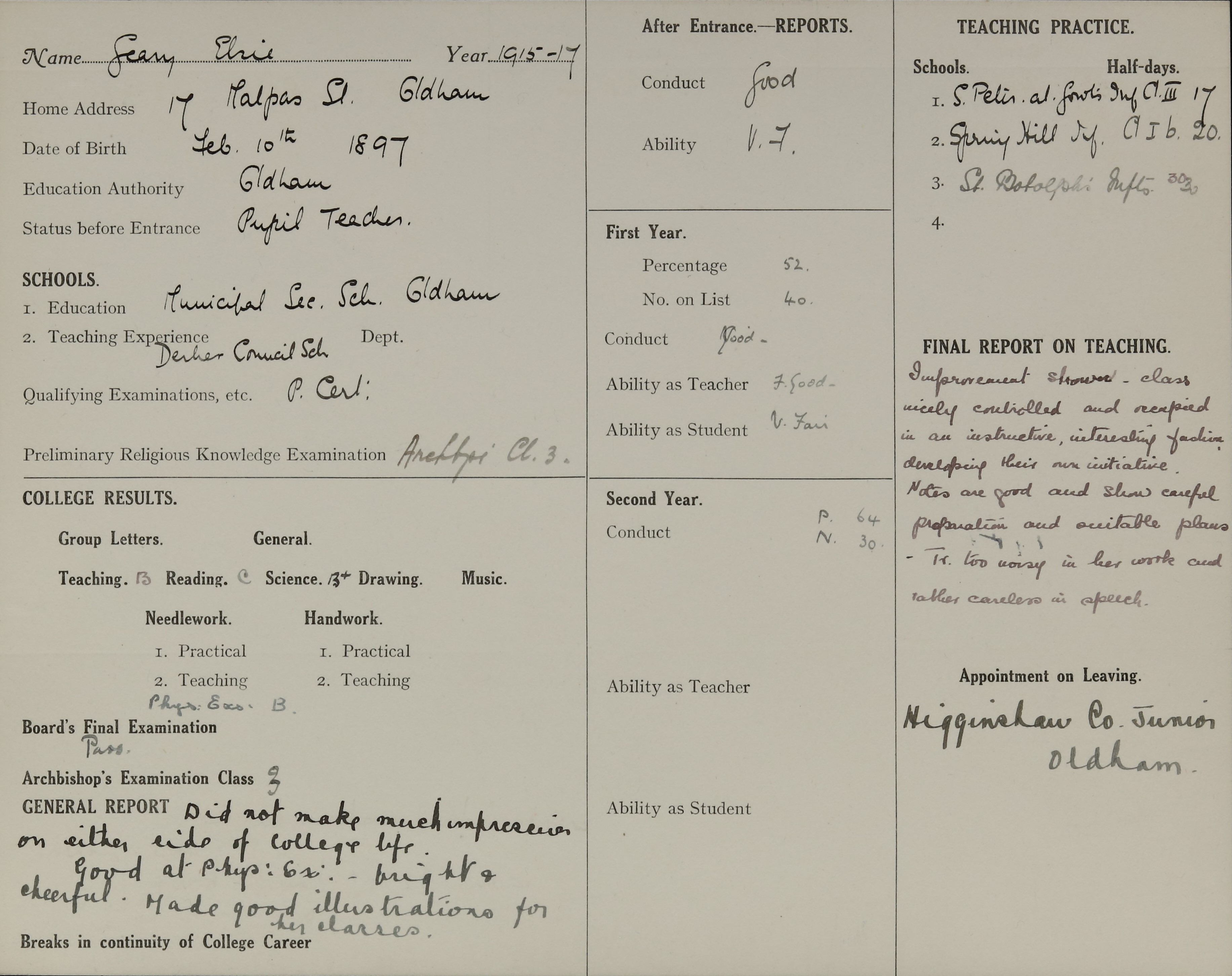 She is at 17 Malpas Street, Oldham. Her father is listed as ‘Machine Worker’. Her mother is unlisted. Elsie and her sister, Amy, are listed as ‘Teacher T C’.