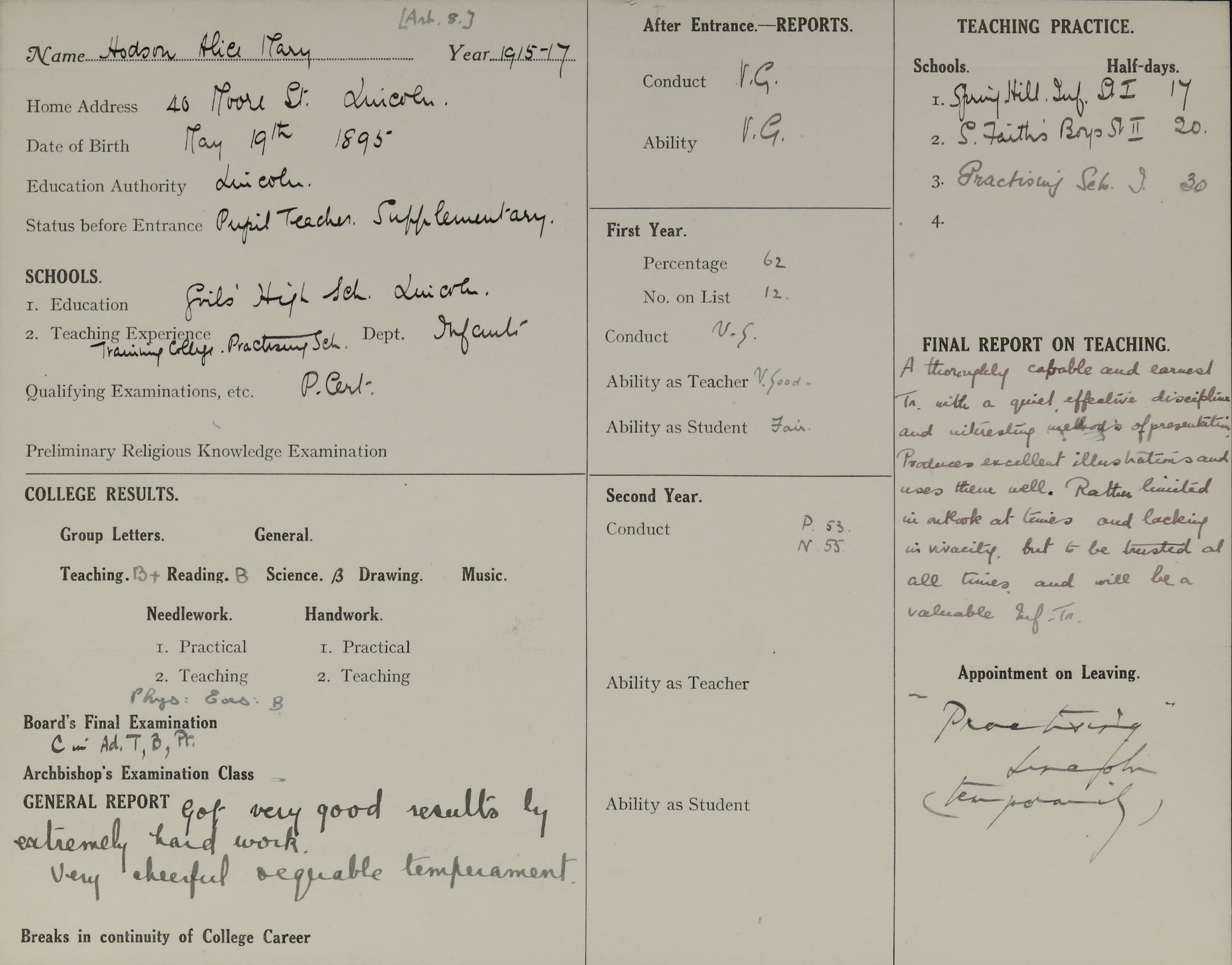 Appointed to Practising Infants, Lincoln (Temporary).