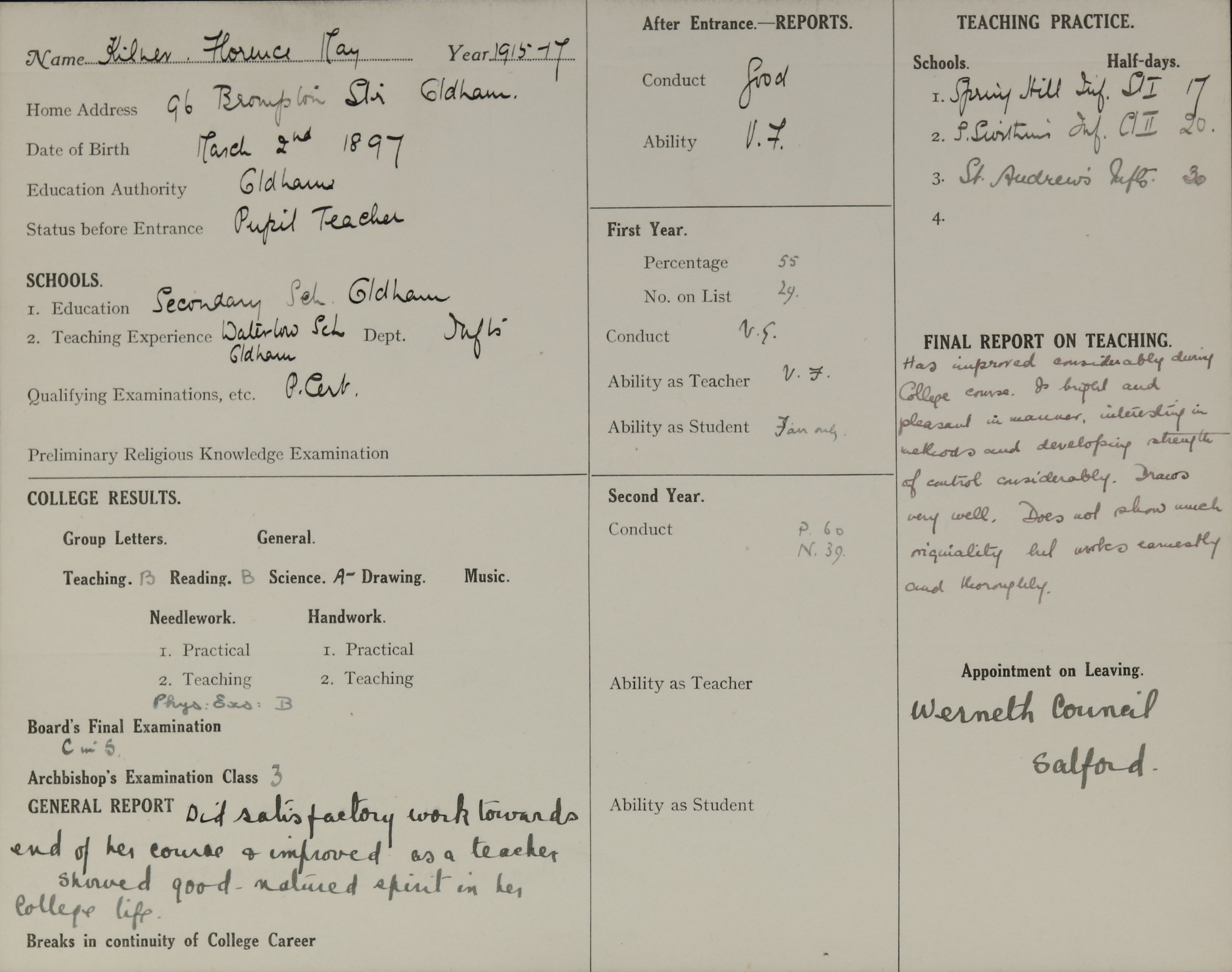 She is at 96 Brompton Street, Oldham. Her mother is an unlisted widow. Her brother, Thomas, is listed as ‘Secretary Cotton Spinning Company’. Florence is listed as ‘Certificated Assistant Teacher’. There is a visitor, Guy Clifford Coop (b. 1899), listed as ‘Assistant Manager of Cinema Hall’.