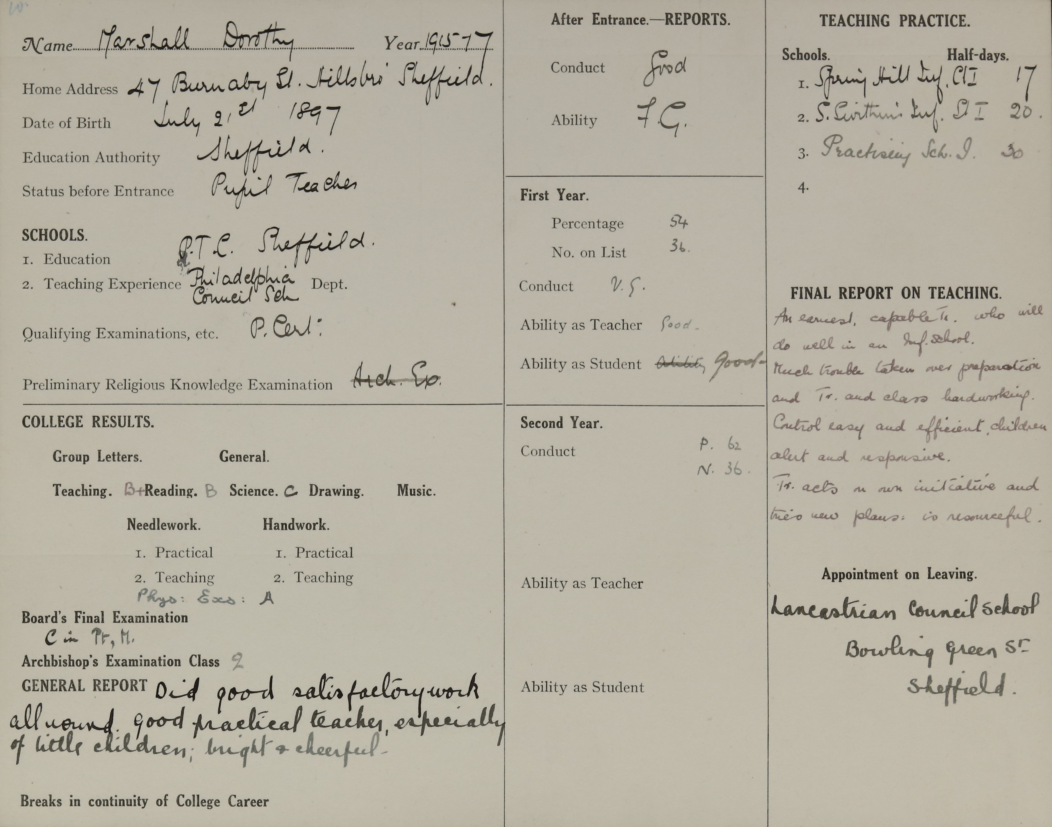 She is at 47 Burnaby Street, Sheffield. Her father and brother, William, are listed as ‘Engine Fitter’. Her mother and siblings, Marjorie and Christopher, are unlisted. Her brother, Frank, is listed as ‘Labourer’. Dorothy is listed as ‘Elementary School Teacher’. Her brother, Harry, is listed as 'Apprentice’.