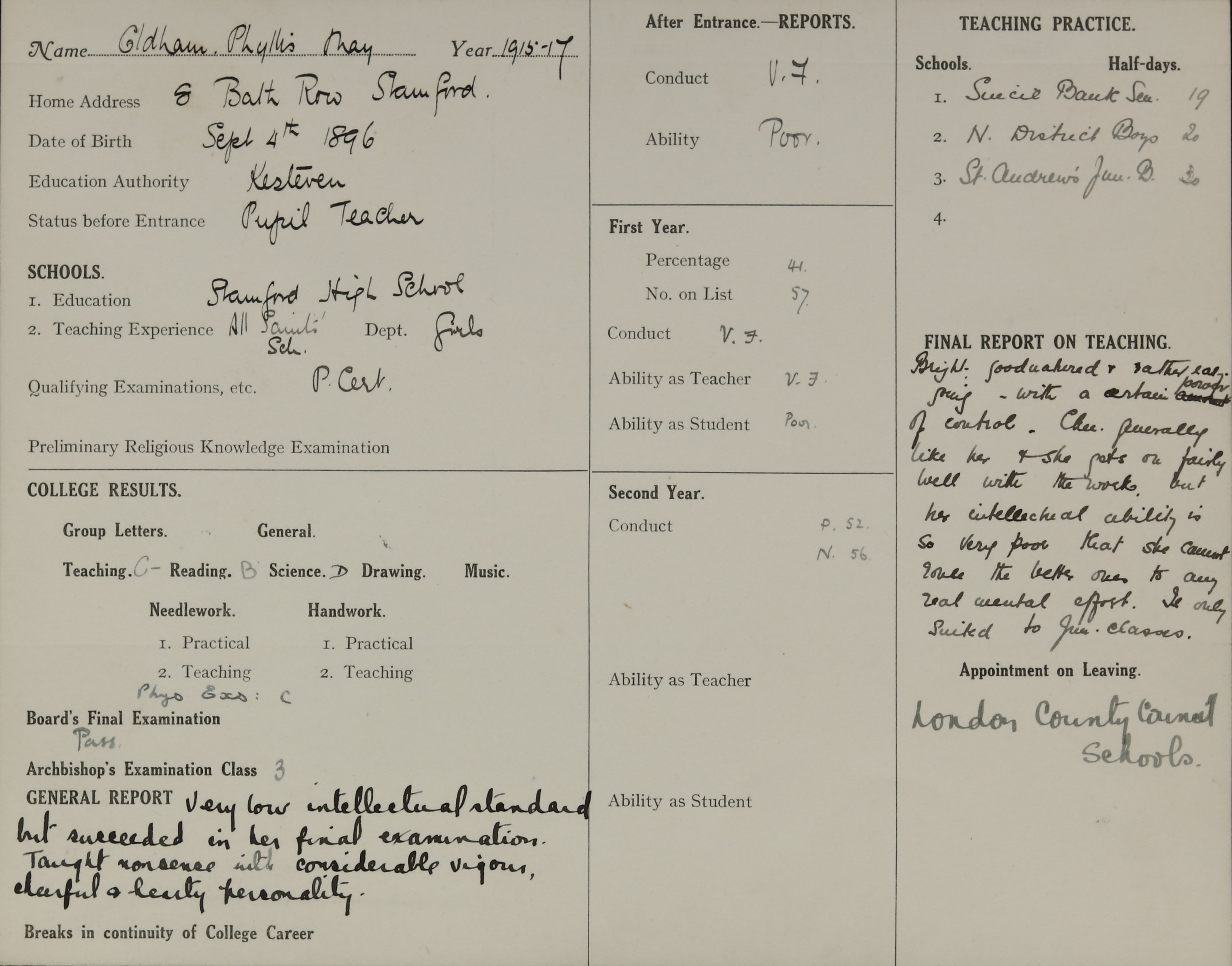 She is at 17 Cheverton Road, Islington. Phyllis and her sister, Evelyn, are listed as ‘Trained Certificated Teacher’.