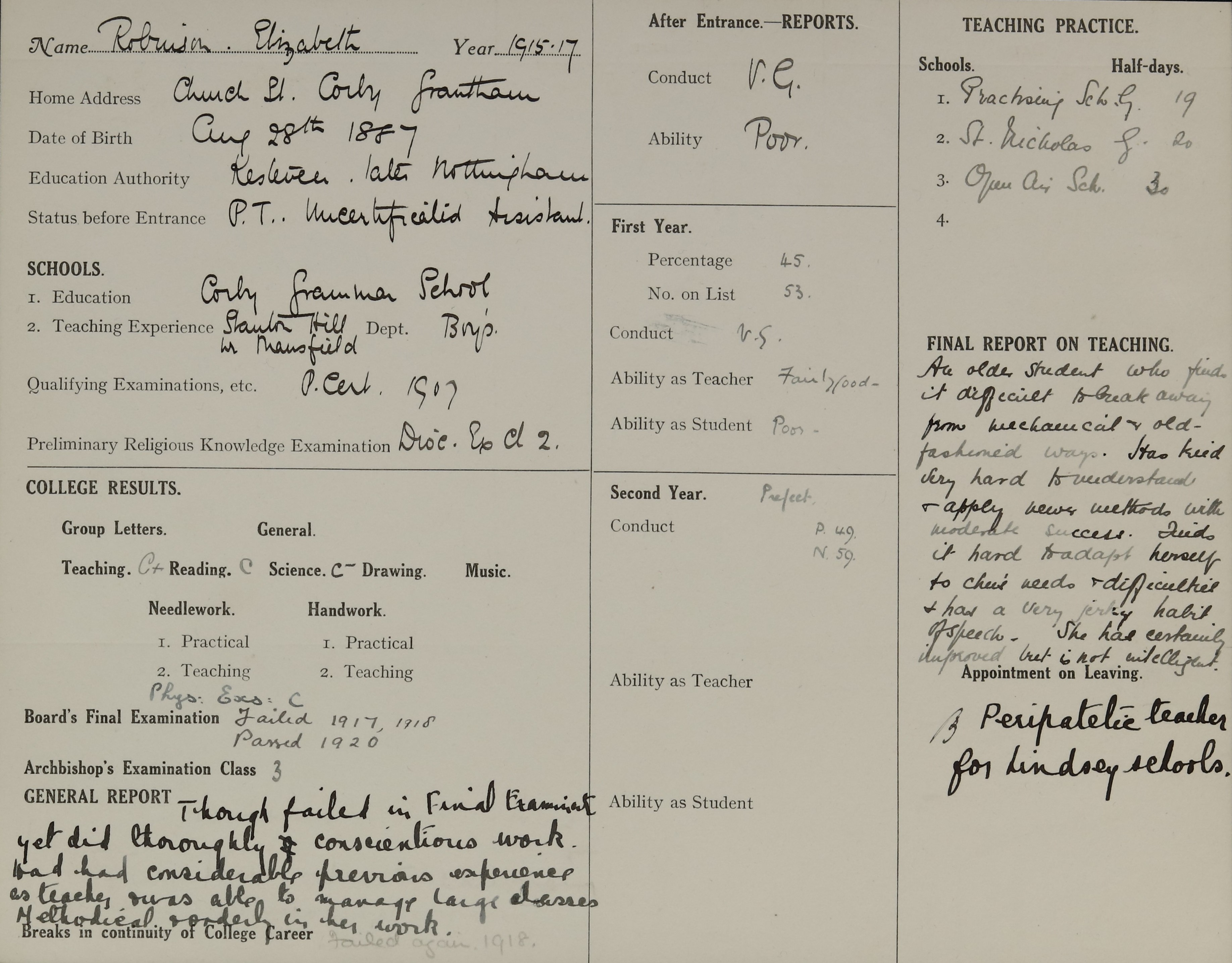 She is at 32 Victoria Road, Ashby as a boarder. The head of the household, Lunn Wood (b. 1878), is listed as ‘Iron Store Jetter’. His wife, Mary Wood (b. 1899), is unlisted. Elizabeth is listed as ‘Teaching’ and a boarder.