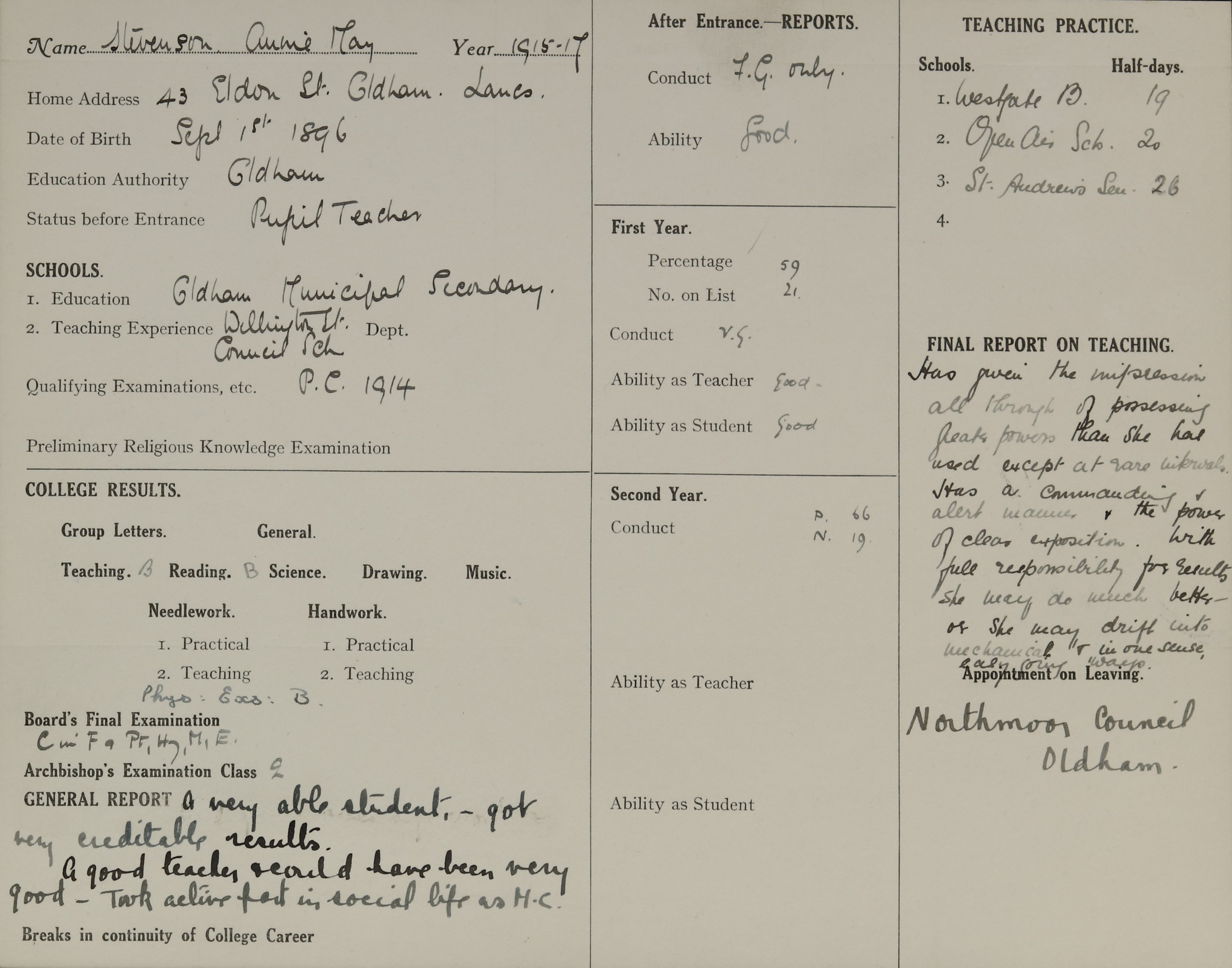She is at 43 Eldon Street, Oldham. Her father is listed as ‘Headmaster of Public Elementary School’. Her sister, Mary, is listed as ‘Assistand Mistress of Public Elementary School’. Her sister, Ethel, is listed as ‘Supplementary Teacher of Public Elementary School’. Her sister, Elsie, is listed as ‘Assistant Mistress of Public Elementary School’. Annie and her sister, Lilian, are unlisted.