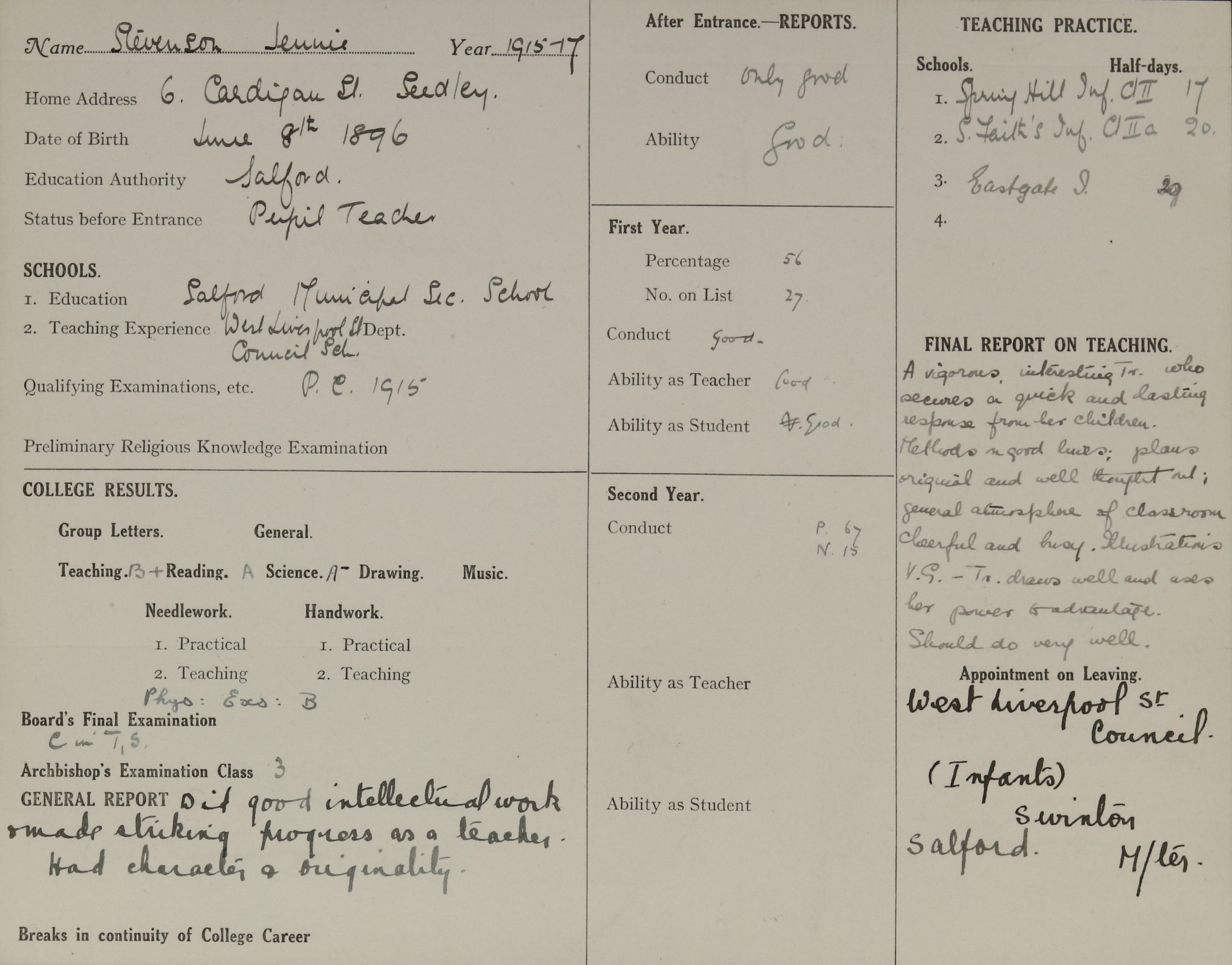 Appointed to West Liverpool Street Council Infants, Salford.