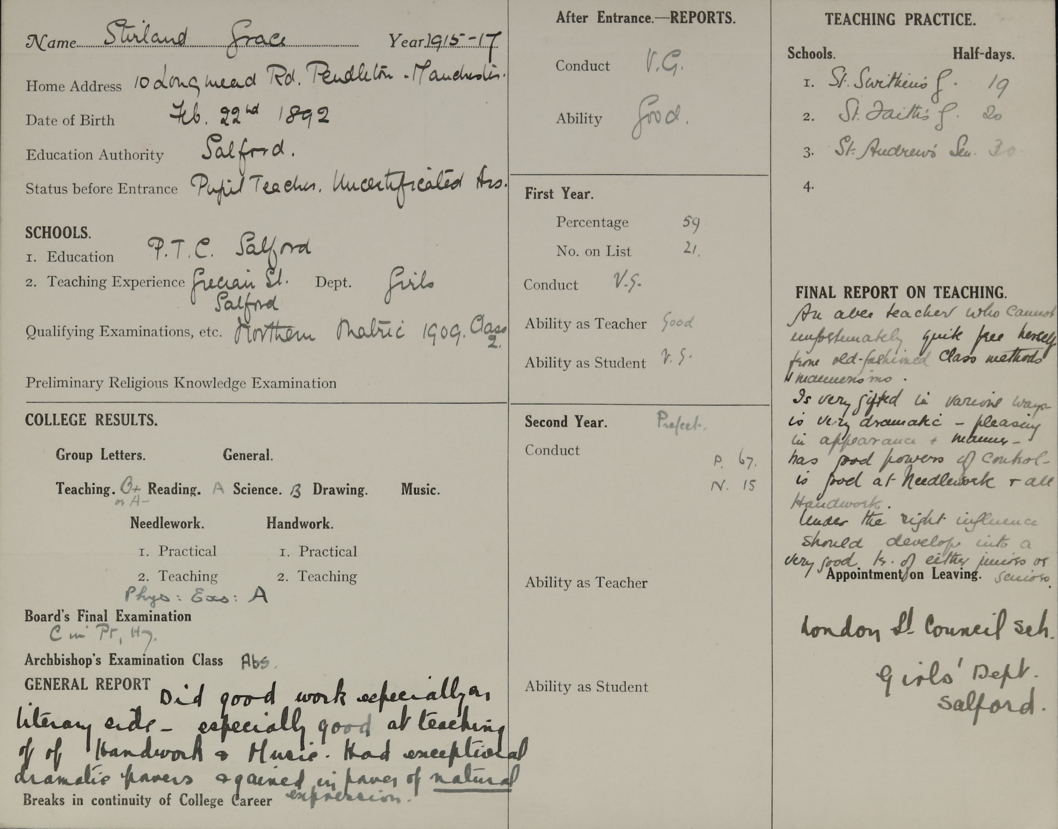 She is at 10 Longmead Road, Pendleton. Her father is listed as ‘Machine Joiner’. Her mother is unlisted. Her sister, Leah, is listed as ‘Shorthand Typist’. Grace is listed as ‘Elementary School Teacher’.