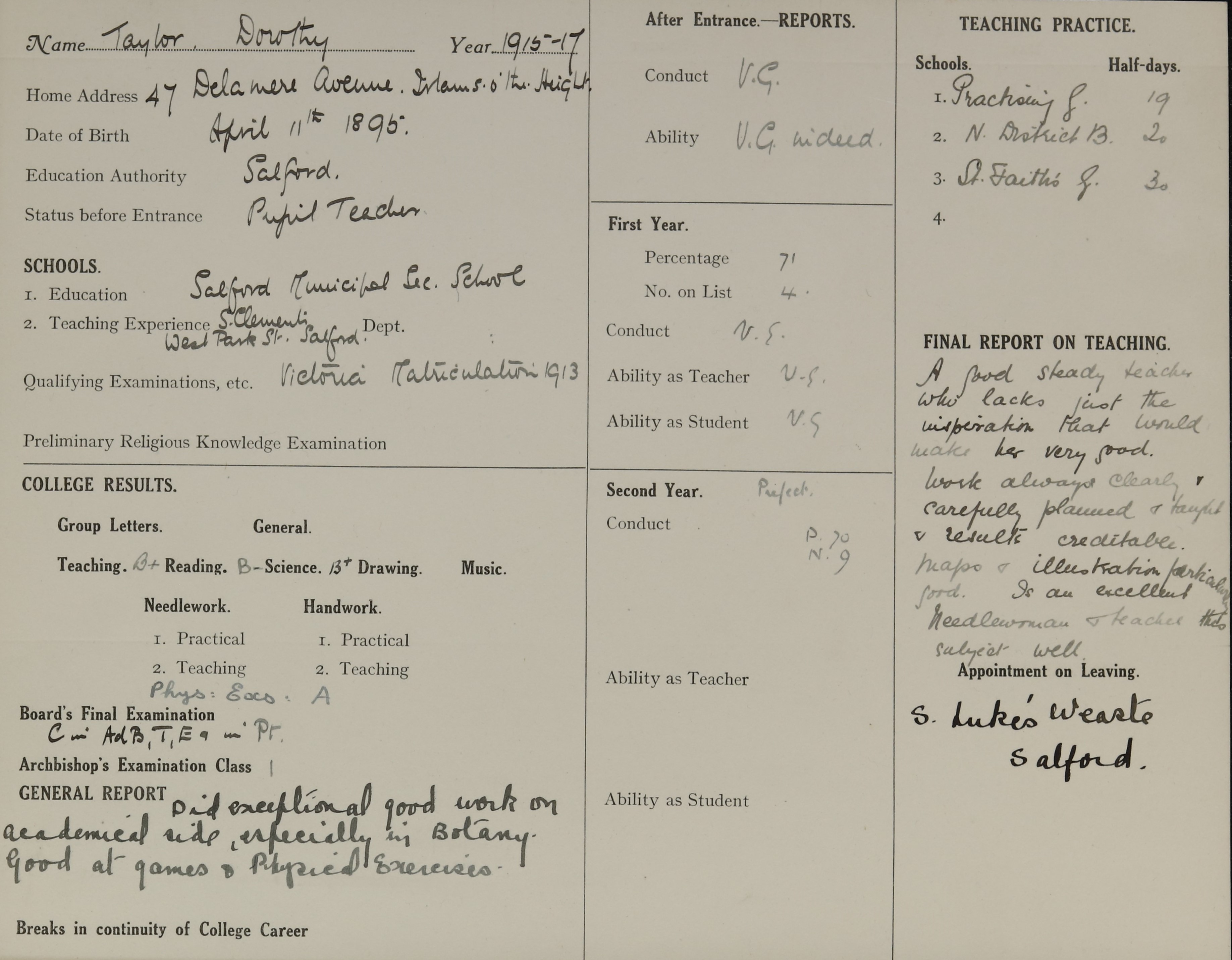 She is at 47 Delamere Avenue, Pendleton. Her father is listed as ‘Cotton Yard Merchant’. Dorothy is listed as ‘Certificated Teacher’. Her mother and niece, Margaret Taylor Barrett (b. 1913), are unlisted. Her sister, Edith, is an unlisted widow.