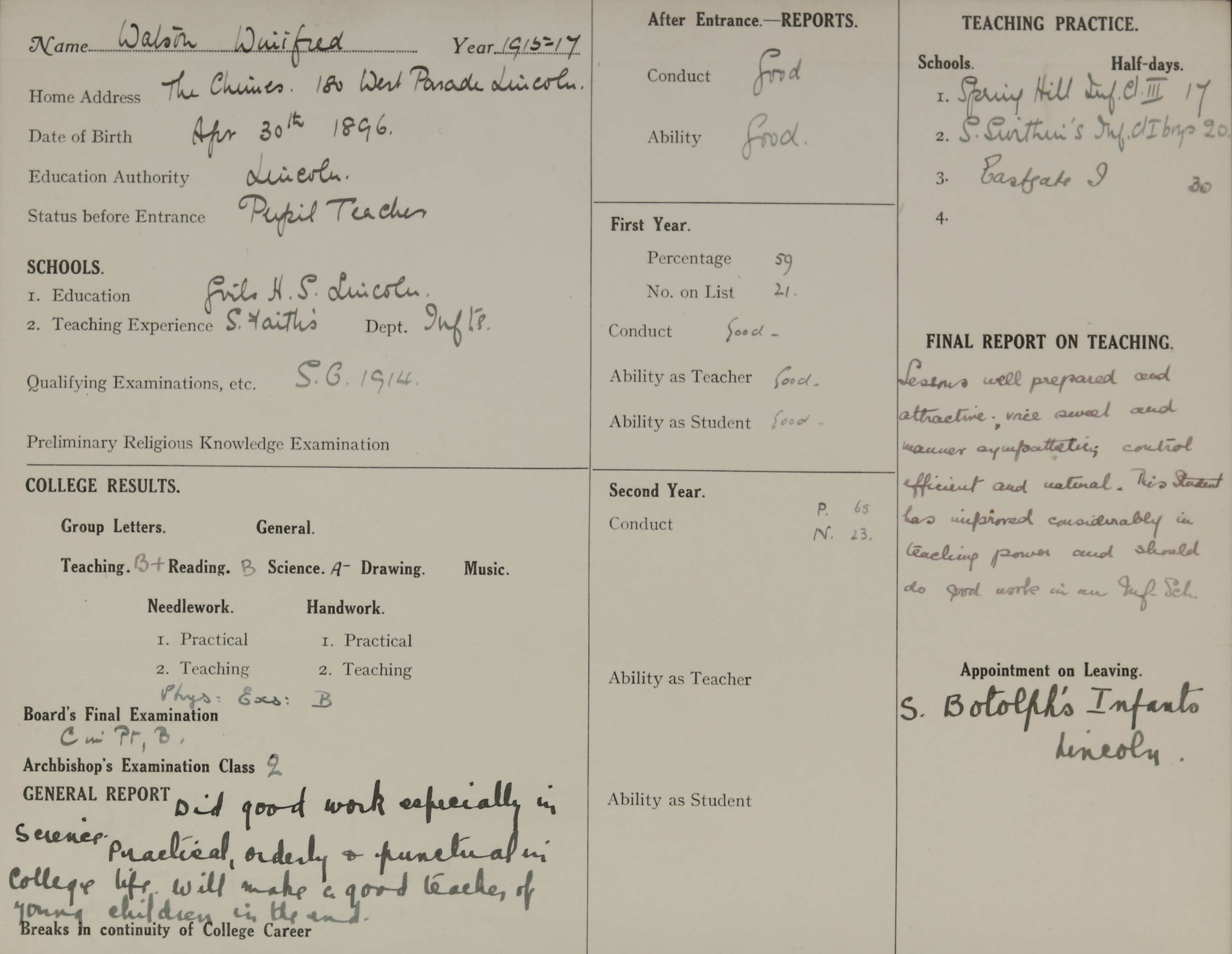 She is at 11A Longdales Road, Lincoln. Her mother is an unlisted widow. Winifred and her sister, Jessie, are listed as ‘Certificated Assistant Mistress’.