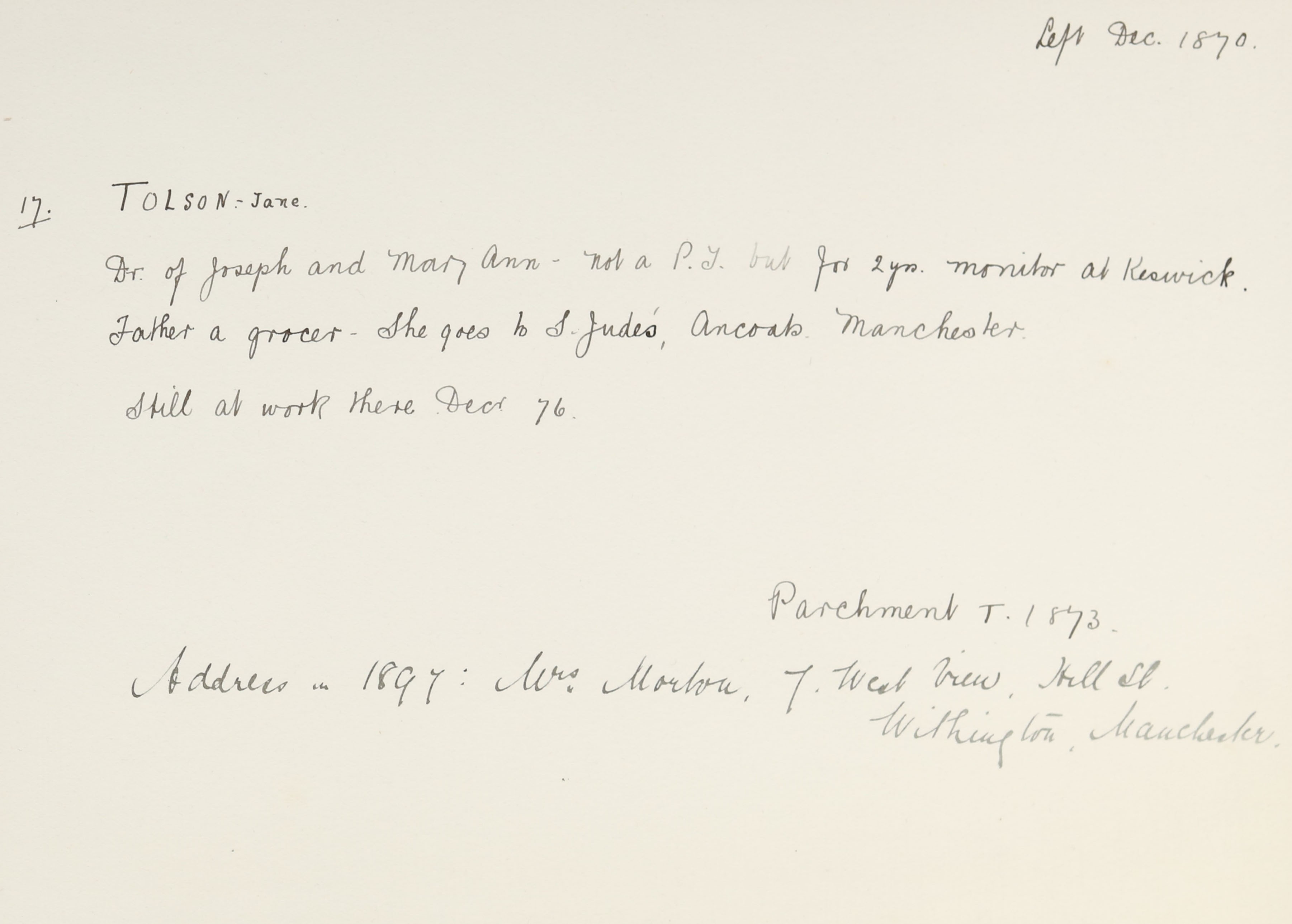 She is listed at 18 Rippingham Road, Withington, Chorlton. Her husband is listed as ‘Grey Cloth Salesman’. Jane is unlisted. Her nephew, Fred Morton (b. 1879), is listed as a ‘Student’.