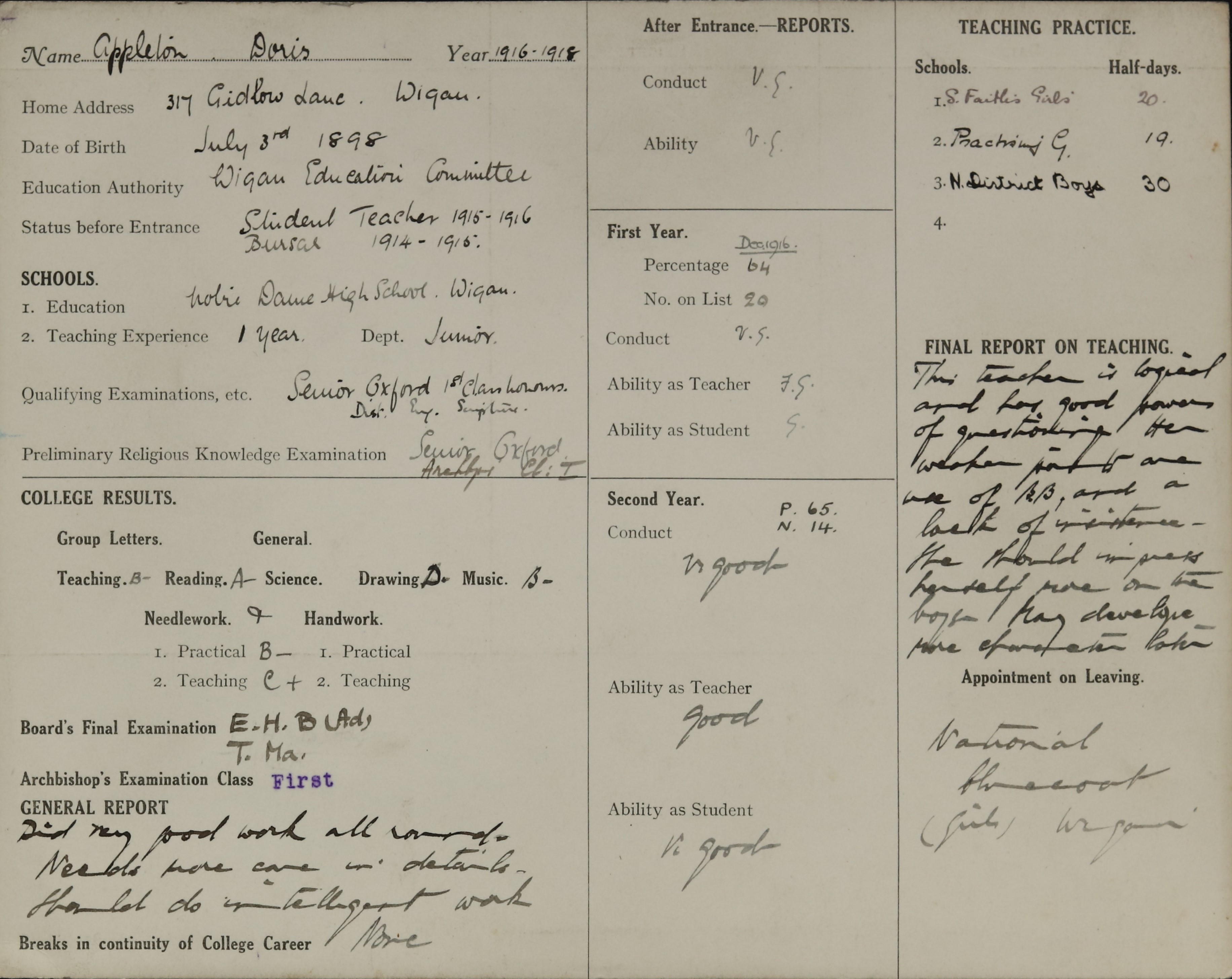 She is at 317 Gidlow Lane, Wigan. Her father is listed as ‘Law Clerk’. Her mother and her brother, John, are unlisted. Doris is listed as ‘Teacher at Elementary School’. Her sister, Elsie, is listed as ‘Clerk in Flour Merchants Office’. Her sister, Annie, is listed as ‘Clerk at Invoice Electric Works’.
