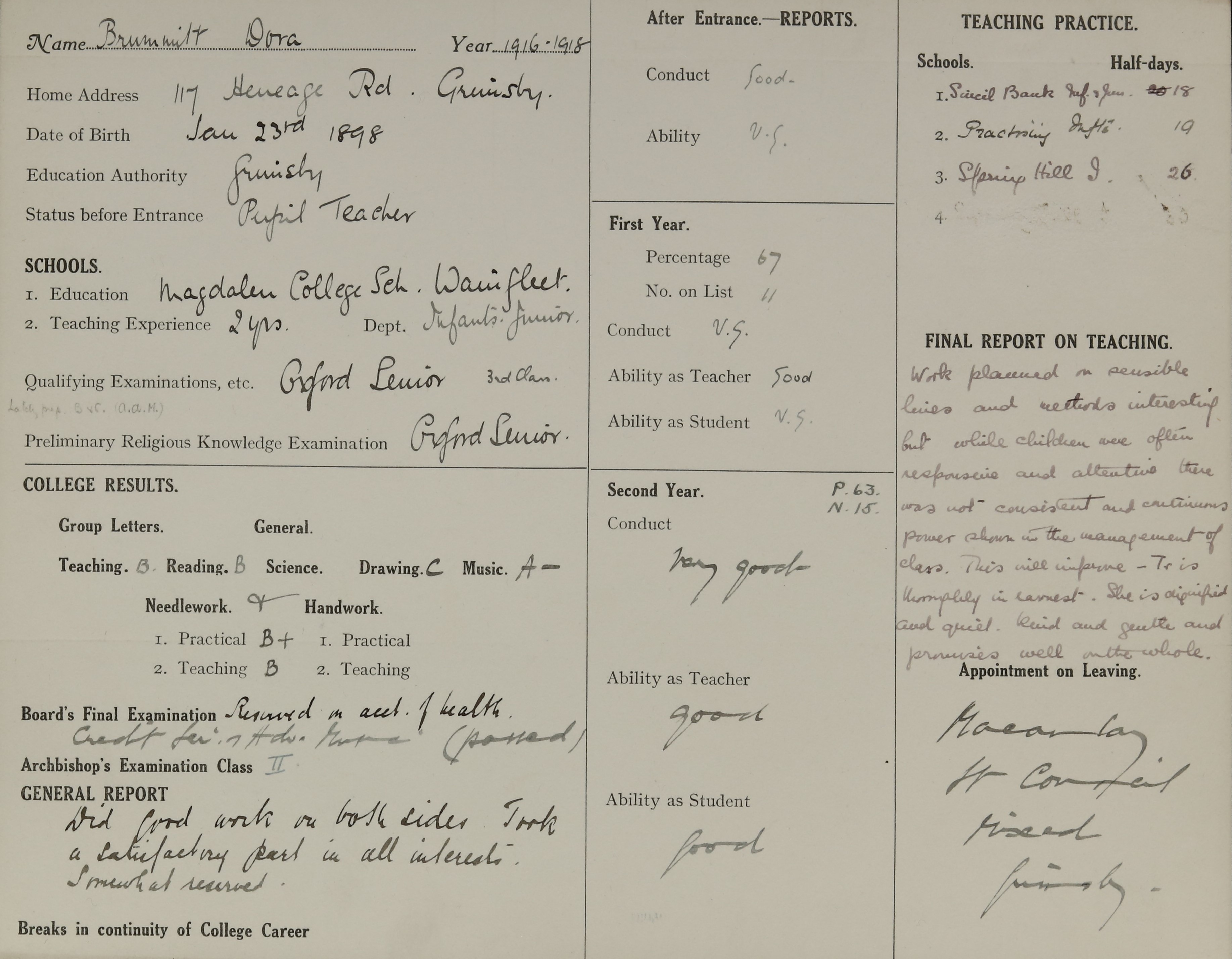 She is at 30 Pasture Street, Grimsby. Her sister, Nellie, is listed as ‘Grocer (Shopkeeper) and General Dealer’. Her father and siblings, Jessie, Bessie and her nephew, Jack, are unlisted. Dora is listed as ‘School Teacher’.