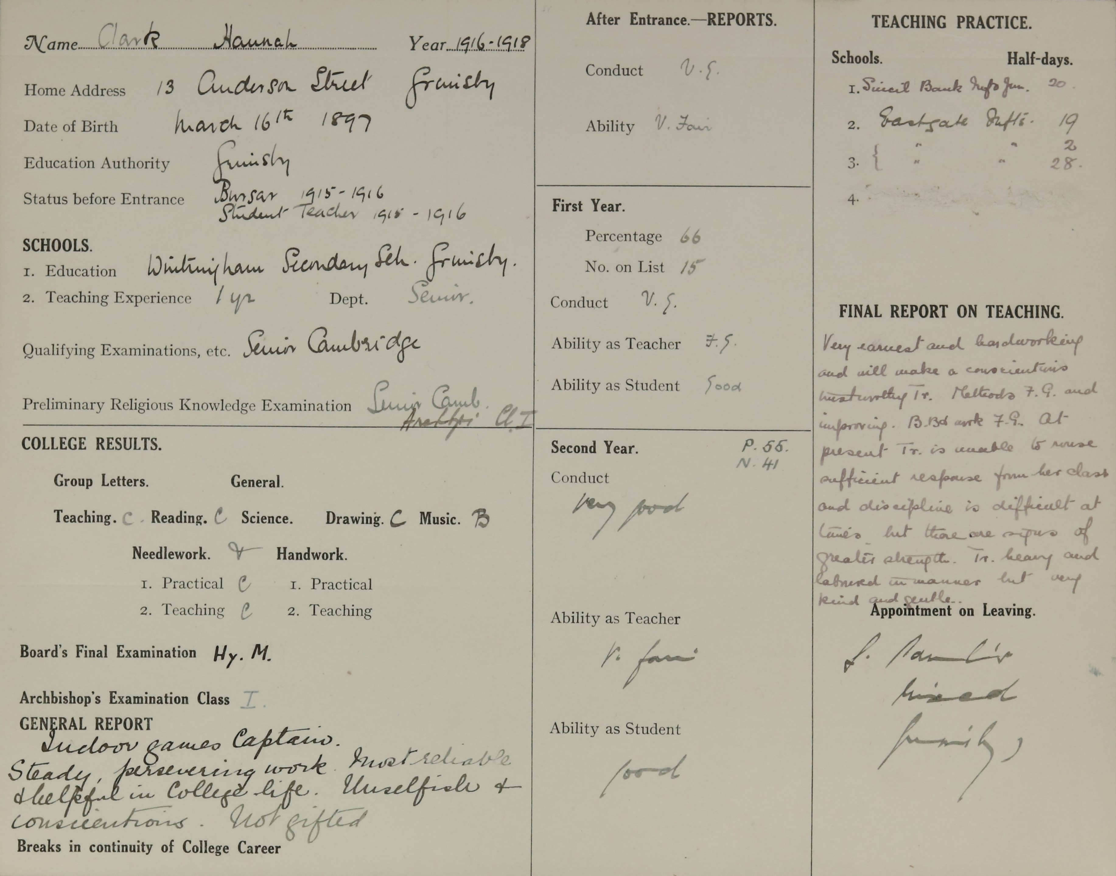 She is at 13 Anderson Street, Grimsby. Her father is listed as ‘Basket Maker Foreman’. Hannah is listed as ‘Trained Certificated Assistant Mistress’. Her sisters, Gertrude and May, are listed as ‘Dressmaker’. Her mother and siblings, Ellen and Edward, are unlisted.