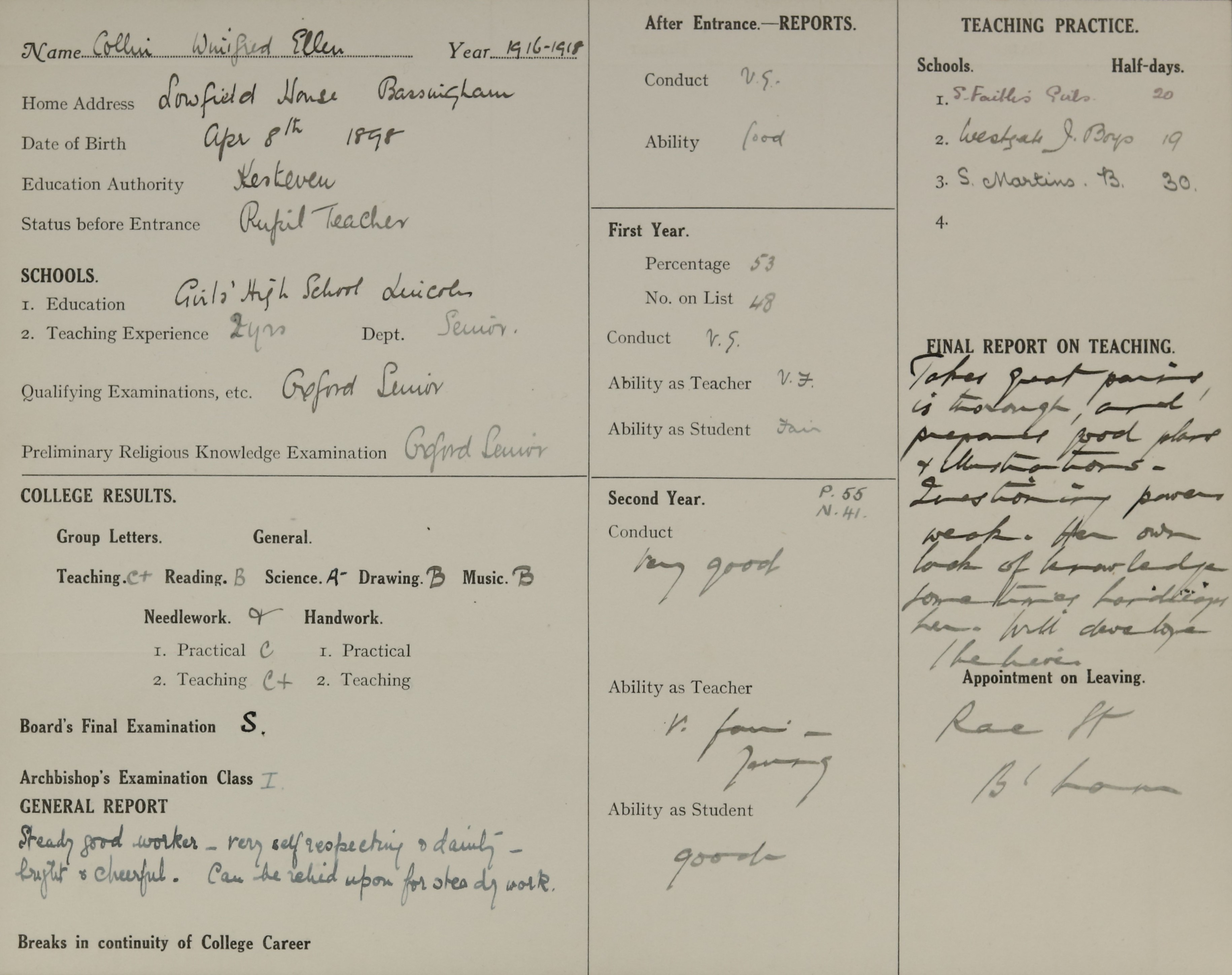She is at 25 Wretham Road, Handsworth as a boarder. The head of the household, Jane Beddows (b. 1851), is listed as ‘Boarding Housekeeper’. Charles Henry Smith (b. 1893) is listed as a boarder and ‘Costing Clerk’. Alice Patching [LDTC 1919] and Winifred are listed as boarders and ‘Assistant School Mistress’. William John Helm (b. 1895) is listed as a boarder and ‘Assistant School Master’. There is a servant, Ellen Florence Child (b. 1903).