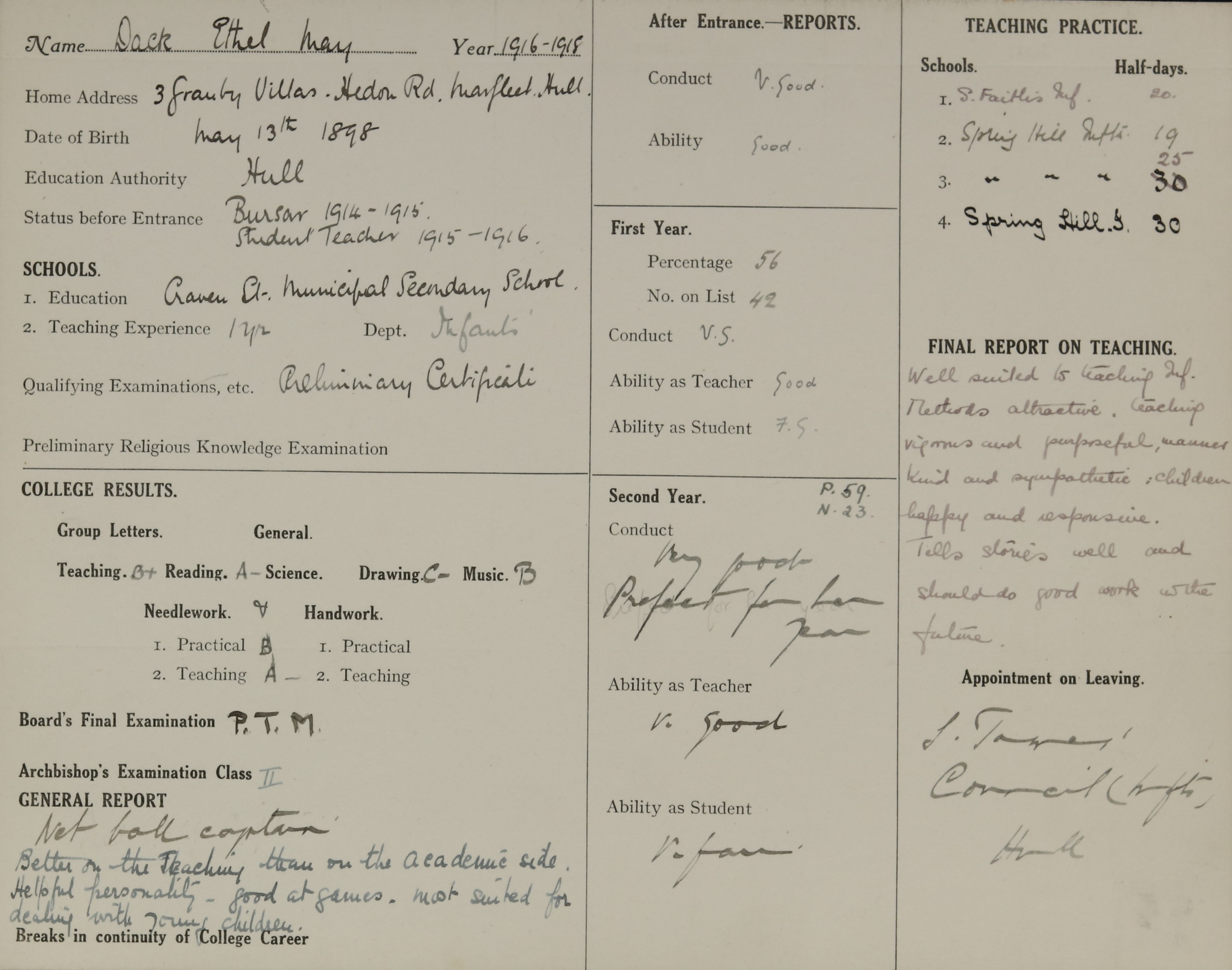She is at 10 Cromwell Street, Hull. Her father is listed as ‘Foreman Dock Gateman’. Ethel, her mother and siblings (Mary, George, Minnie, Stephen, Amy and James) are unlisted. Her aunt, Florence Jane Dack (b. 1884) is listed as ‘Laundry Clerk’.