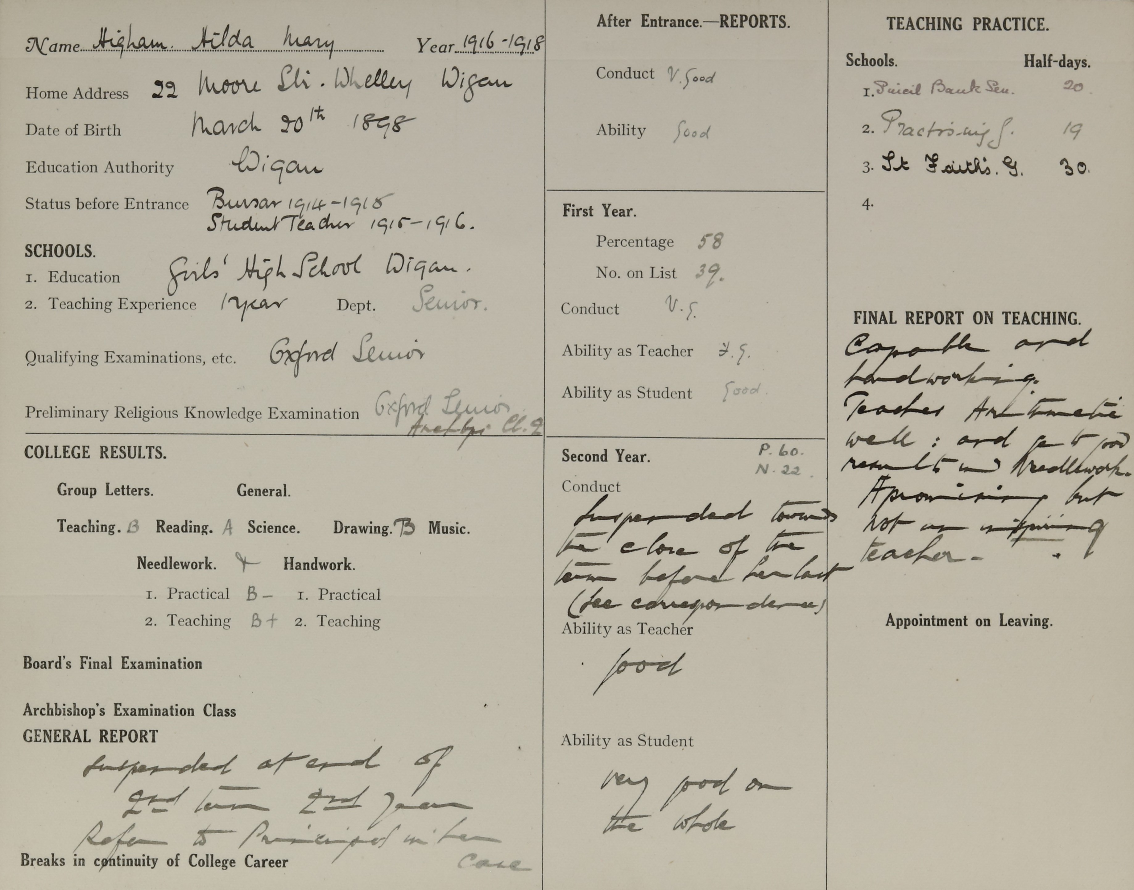 She is at 22 Moore Street, Wigan. Her mother and brother, Harold, are unlisted. Her brother, Albert, is listed as ‘Engine’s Fitter’. Hilda is listed as ‘School Teacher Elementary’. Her brother, John, is listed as ‘Metal Turner’.