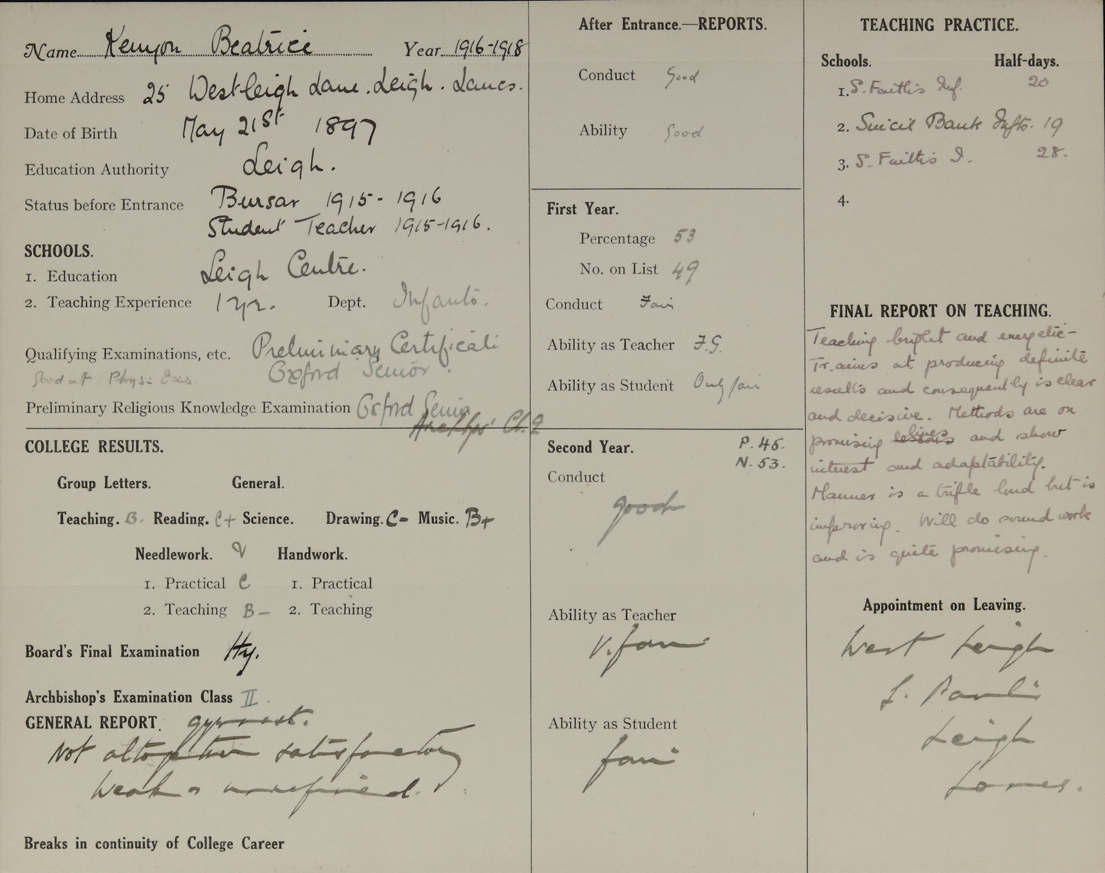 She is at 25 Westleigh Lane, Leigh. Her aunt, Emma Kenyon (b. 1861), is listed as ‘Cotton Reeler’. Her aunt/HER MOTHER, Ellen Ann Kenyon (b. 1872), is unlisted. Beatrice is listed as ‘Trained Certificated Teacher’.