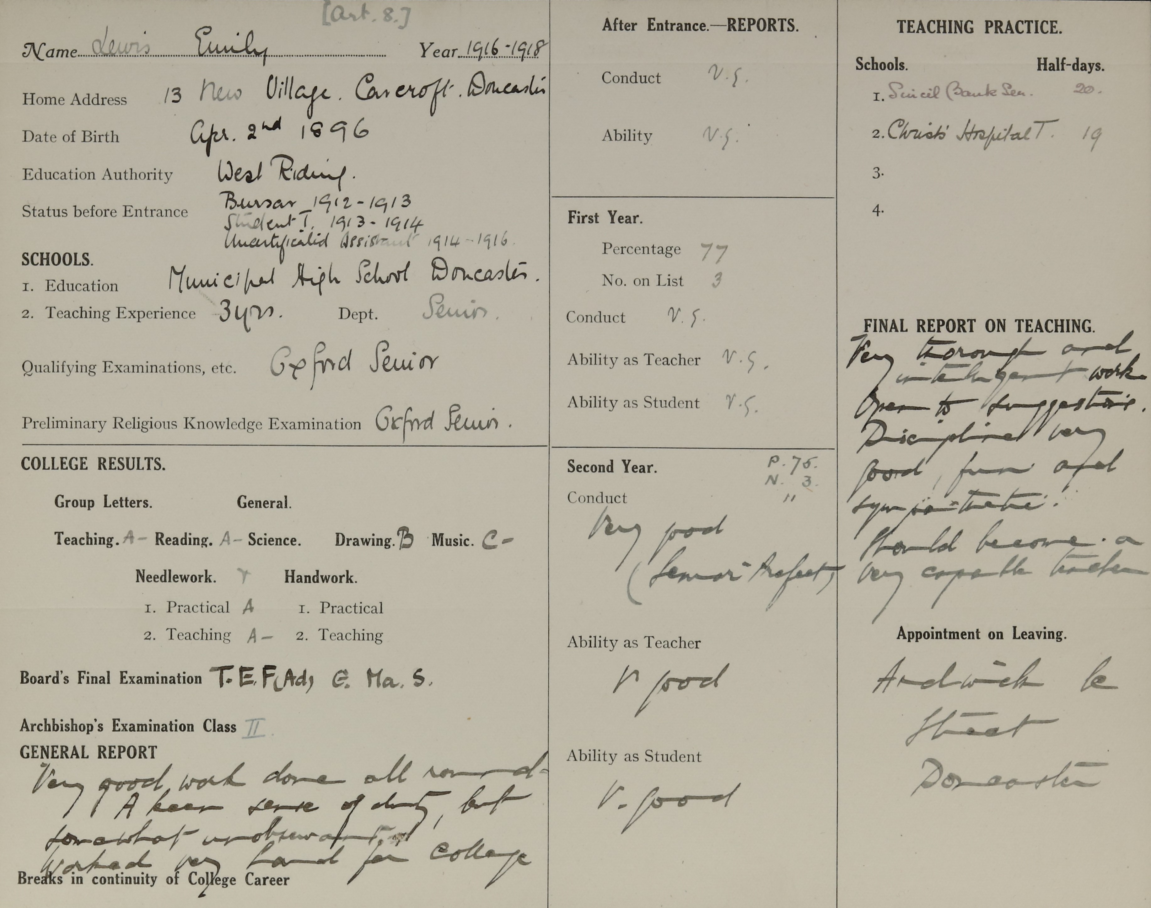 She is at 13 New Village, Carcroft, Adwick Le Street. Her mother and sister, Constance, are unlisted. Emily and her sister, Jessie, are listed as ‘Teacher’. Her brother, Harry, is listed as ‘Coal Miner Corporal’. Her brother, John, is listed as 'Coal Miner Haulage Hand’.