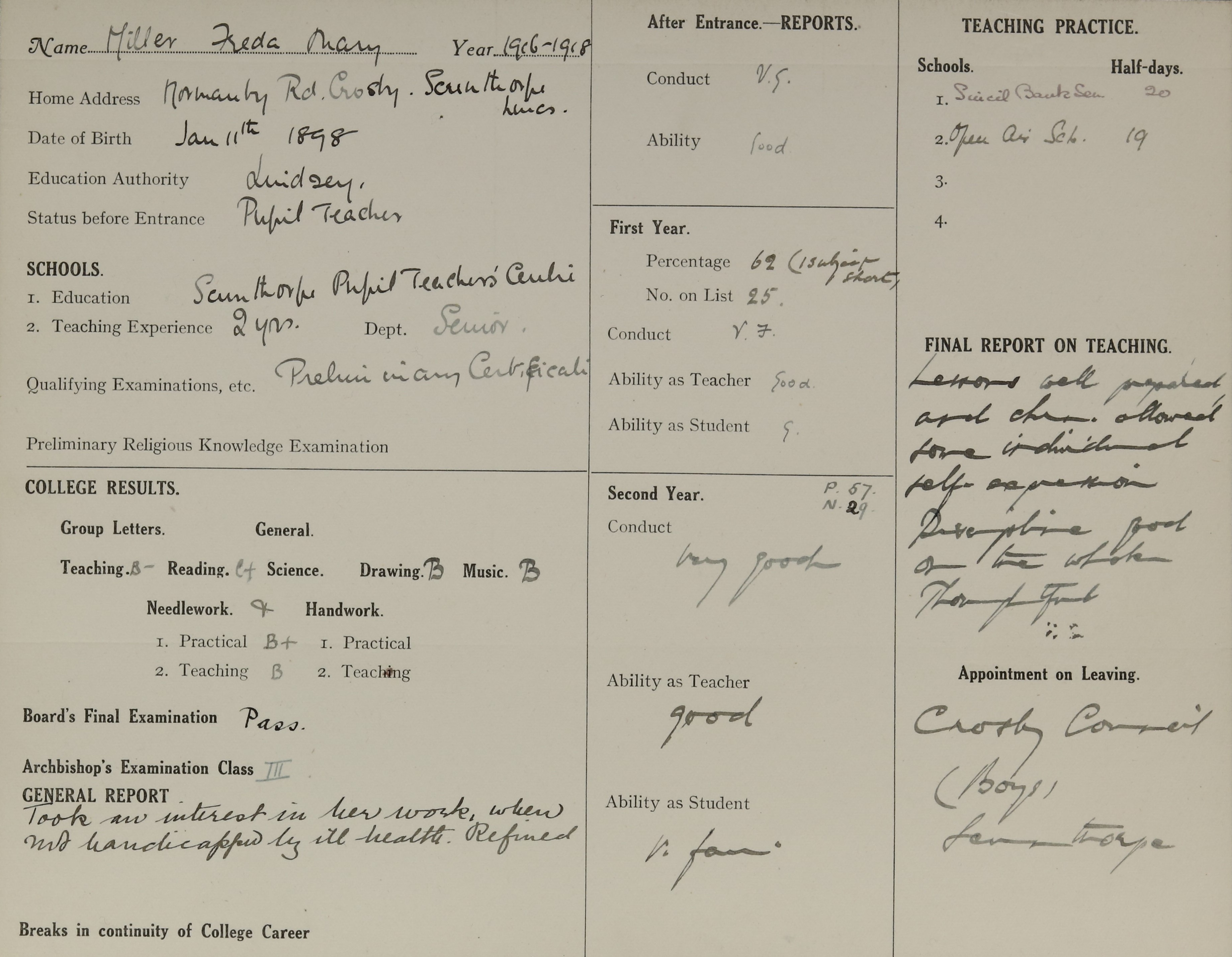 She is at 6 Normandy Road, Scunthorpe. Freda and her sister, Jane, are listed as ‘School Teacher’. Her mother is unlisted. Her father is listed as ‘Foundry Manager’.