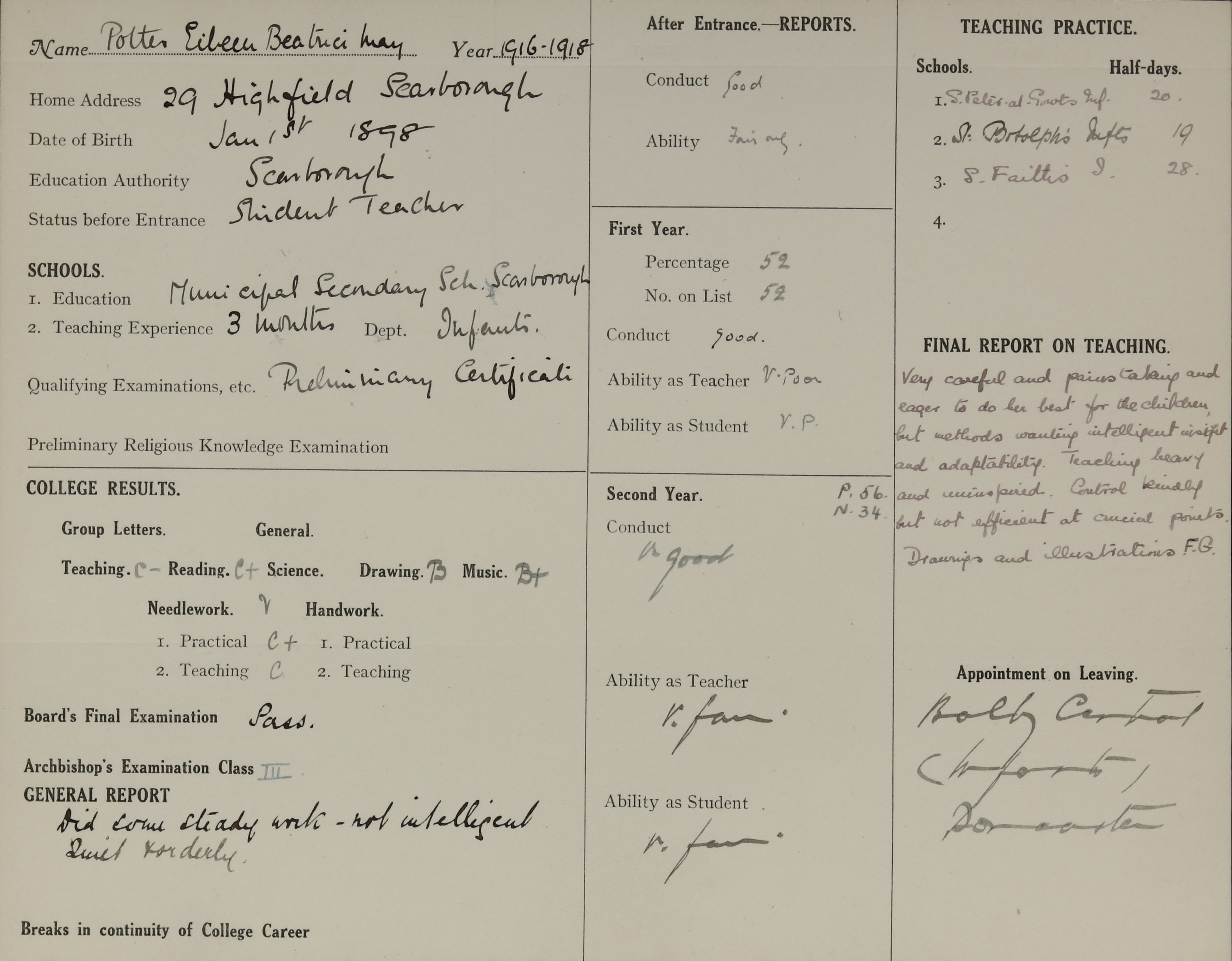 She is at Fayreholme, Racecourse Road, Scarborough. Her father is listed as ‘Builder Retired’. Her mother is unlisted. Eileen is listed as ‘Elementary School Teacher’.