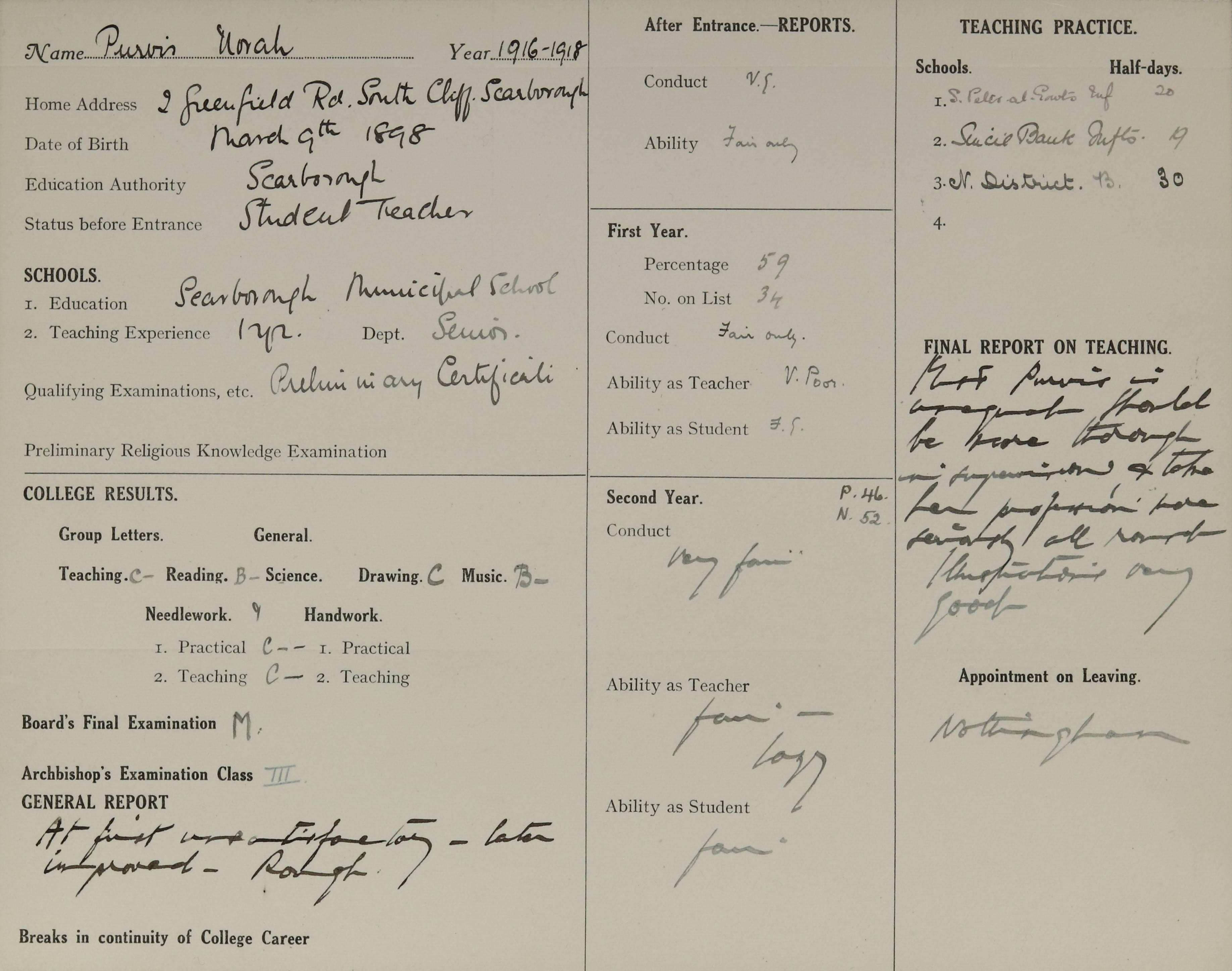 She is at 3 Aberdeen Place, Scarborough. Her paternal grandmother, Sarah A Purvis (b. 1854), is listed as widow and ‘Laundress’. Her aunt, Minnie Purvis (b. 1873), is listed as ‘Upholstress’. Her father is listed as ‘Cabinet Maker’. Norah, her mother and siblings (May and James) are unlisted.