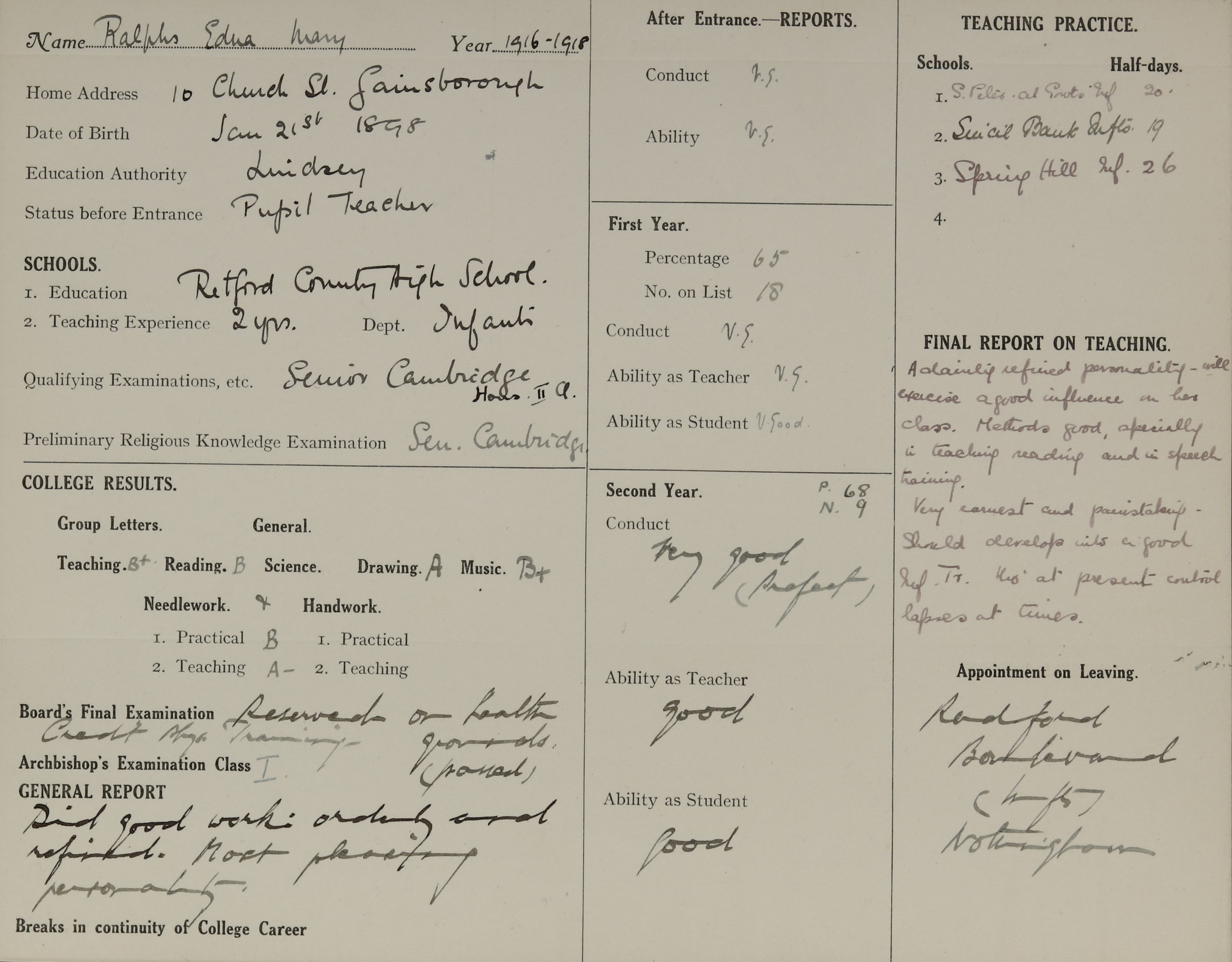 She is at 10 Church Street, Gainsborough. Her father and uncle, Leonard Ralphs (b. 1879), are listed as ‘Tailor’. Edna, her mother and sister, Doris, are unlisted.